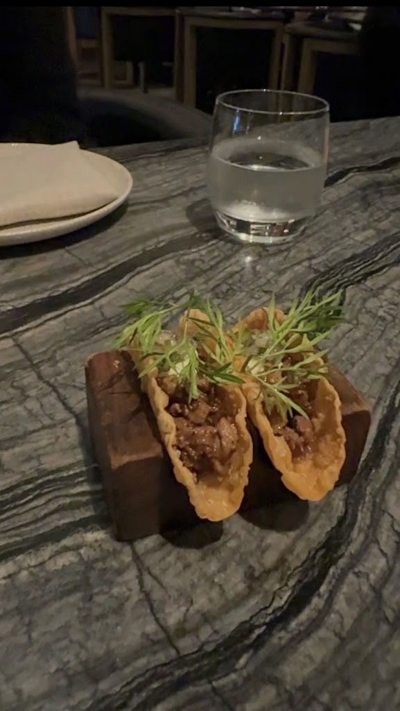 First time dining here and I will definitely be back! Low lighting created a romantic atmosphere and placed our attention on the offerings of the restaurant rather than other guests. The service was great, with water being topped up every few minutes and friendly staff who were always helpful and smiling. The tasting menu was exceptional for the price and while they were out of stock of an item, the manager apologised and gave us both a glass of great wine before we even needed to ask! They were very attentive, and went out of their way to ensure every guests experience on the night was perfect. The wagyu tacos were our personal favourite, and the flavours of the grilled meat really came through. The cocktails were also of high quality and presented very well.
