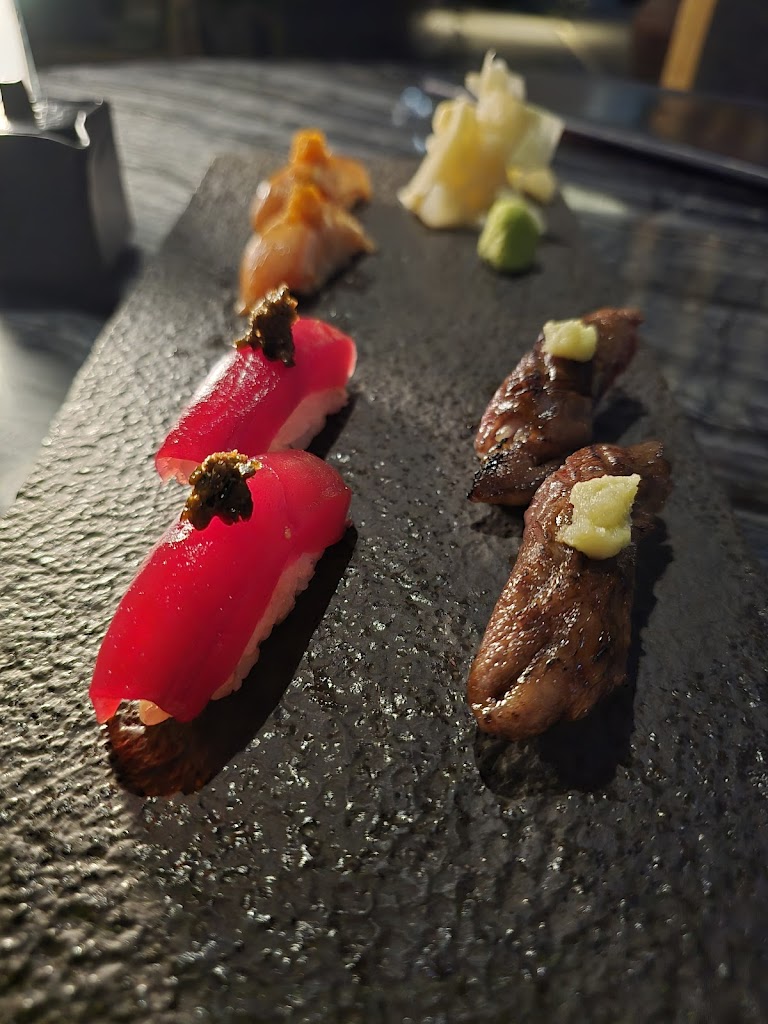 We got the tasting menu for $120 and felt as if the food wasn t worth the value. The best tasting dishes were the steak and the dessert, the rest were quite underwhelming. The dishes were brought out multiple at once, leaving the table a clutter and letting certain dishes come down to room temperature and having a slight rush felt. Additionally, we had requested for no wasabi on our nigiri but the chefs still added that in, but replaced it after telling the waiter with no hassle. Customer service was great but the food was quite underwhelming for the price paid .