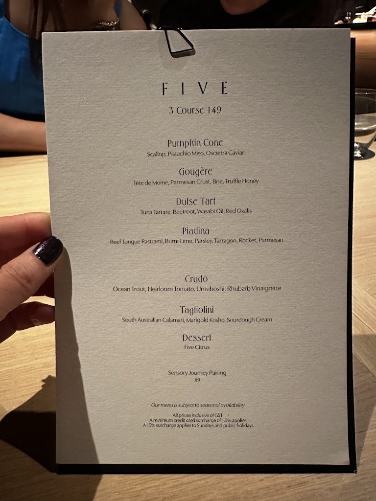 A great experience out. The food was excellent and the service and atmosphere was second to none. I have been to more than a few fine dining restaurants in Sydney but Five Dining stands out to me in terms of the service and food. I always like to watch the kitchen work whenever it’s open kitchen. I think the chefs here are some of the most cool, calm, and collected I’ve seen. A lot of the times they were working without a word uttered but everyone knew their part, like when the head chef would be grating some cheese and someone would come at the right moment with a container to catch the cheese block. A well oiled machine. The service was really good as well. The timing between each course was well timed. Overall there is nothing better they could have done that I could have asked for. This is one of the few fine dining places I would not hesitate to come back to and definitely will because I enjoyed it that much.
