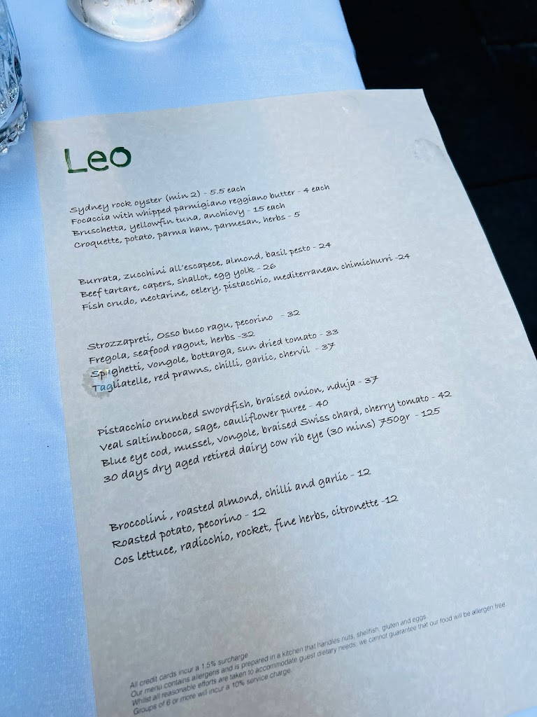 Outstanding lunch today at Restaurant Leo. Staff were kind enough to bring a high chair out for our baby and drag over an umbrella to give us shade during our outdoor lunch. Food was delicious. Not your typical “Spag bol” kind of Italian, but also not pretentious/fine-dining - a happy medium of amazing entrees of Beef Tartare and Kingfish, and perfectly made pasta dishes. Unfortunately I was too full to enjoy dessert (and I had to rush back to the office), but I would happily recommend and return here. And for the love of God, order the bread.