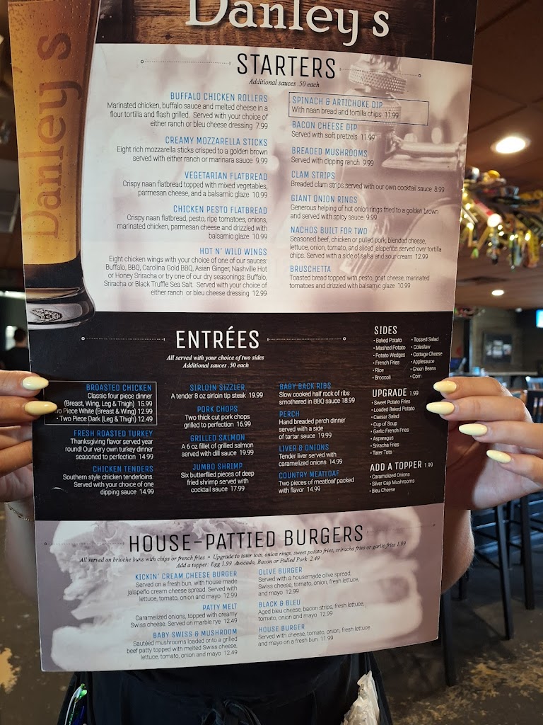 The only reason I am giving Danleys a 2 star review is because we had a nice waitress and we like the owners. My food came out incorrect today (for about the 4th time I have came in lately) I usually just let it go but this time mentioned it to a manager that walked by asking if everything was ok. She took my food to be redone after criticizing her own kitchen staff calling them airheads back there , then walked back over to me and said she thinks I m wrong about my food order being incorrect. At that point I just took the food because I m not going to argue with staff when I am out trying to enjoy myself with my family on my one day off. Then, while we sat at the high top we could hear 5 members of the staff gathered around the bar talking badly about us as if it was our fault they messed our order up. I m very disappointed, as we use to love coming to Danleys. Our server was amazing, although I think we will be taking a break from Danleys for now.