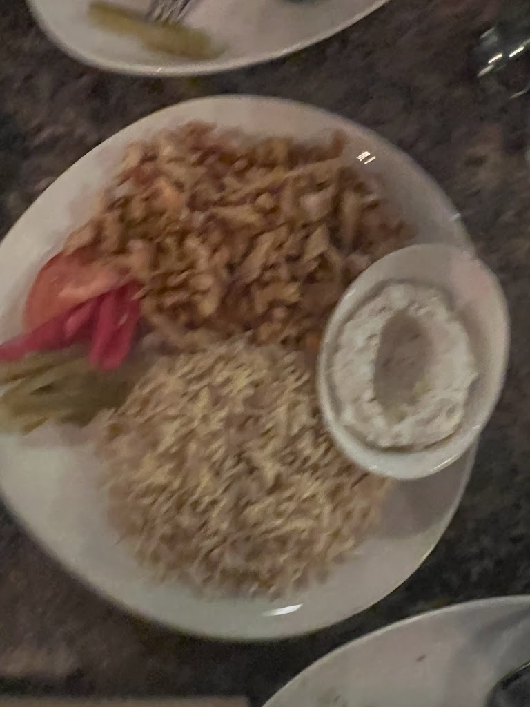 Food garbage guys serving a shawarma plate with dry chicken my buddy got lamb chopa they put jello on the plate like there serving in a michelin 3 star restaurant for designs. Bread a dips are all youll enjoy.