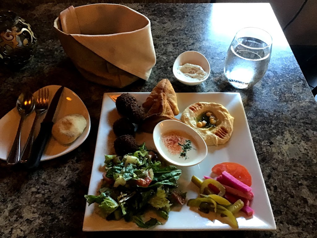 The food was delicious. We shared the veggie platter with a side of beef shawarma. The bread and garlic sauce they bring to the table is so good. Had a mojito which was excellent.