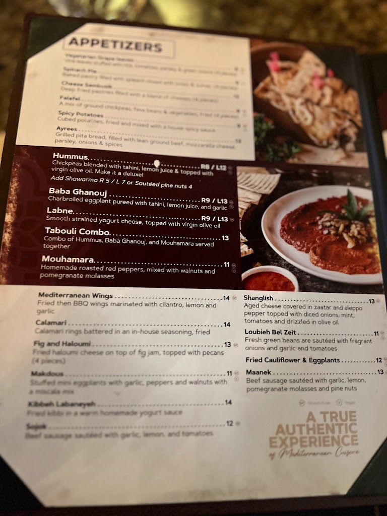 I went here for dinner with a friend whos gluten-free. Im a huge fan of middle eastern food and was delighted with everything we ordered. The meat platter was perfectly cooked tasted fresh off a charcoal grill. The grilled red snapper was a standout. It was perfectly cooked and delicious. The gluten free pita was so good that we bought extra to take home. Vegetarian options: Menu clearly marks vegetarians items.