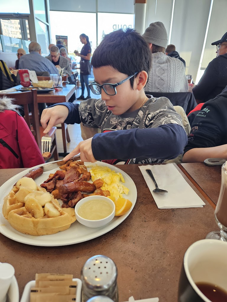 With our grandchildren different dishes fresh brie good fresh fruit large quantities good coffee smoothies Fast and courteous service thank you see you next week