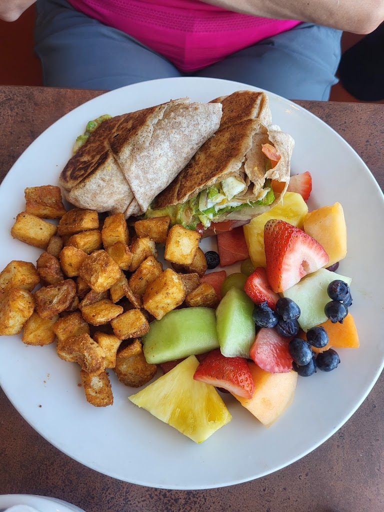 A hearty breakfast with lots of fruit with fast service and a wonderful smile.