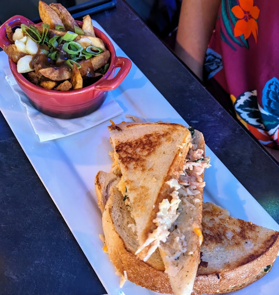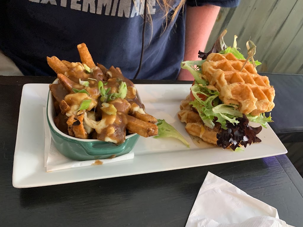 Great lunch here today. Stopped in on a whim and glad we did. The harvest salad was delicious with fresh fruits, as was the lobster grilled cheese. Our son loved his poutine and also enjoyed the chicken and waffles. My roasted veggie sandwich and sweet potato fries hit the spot too. However, as good as the food was, the service was even better. Our server was excellent: very polite, pleasant and extremely helpful. Nice to find a great new place that we need to visit again!