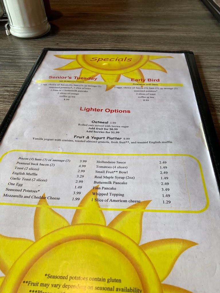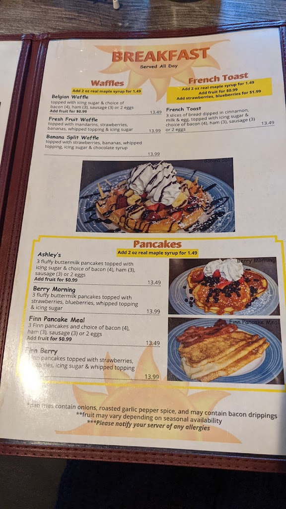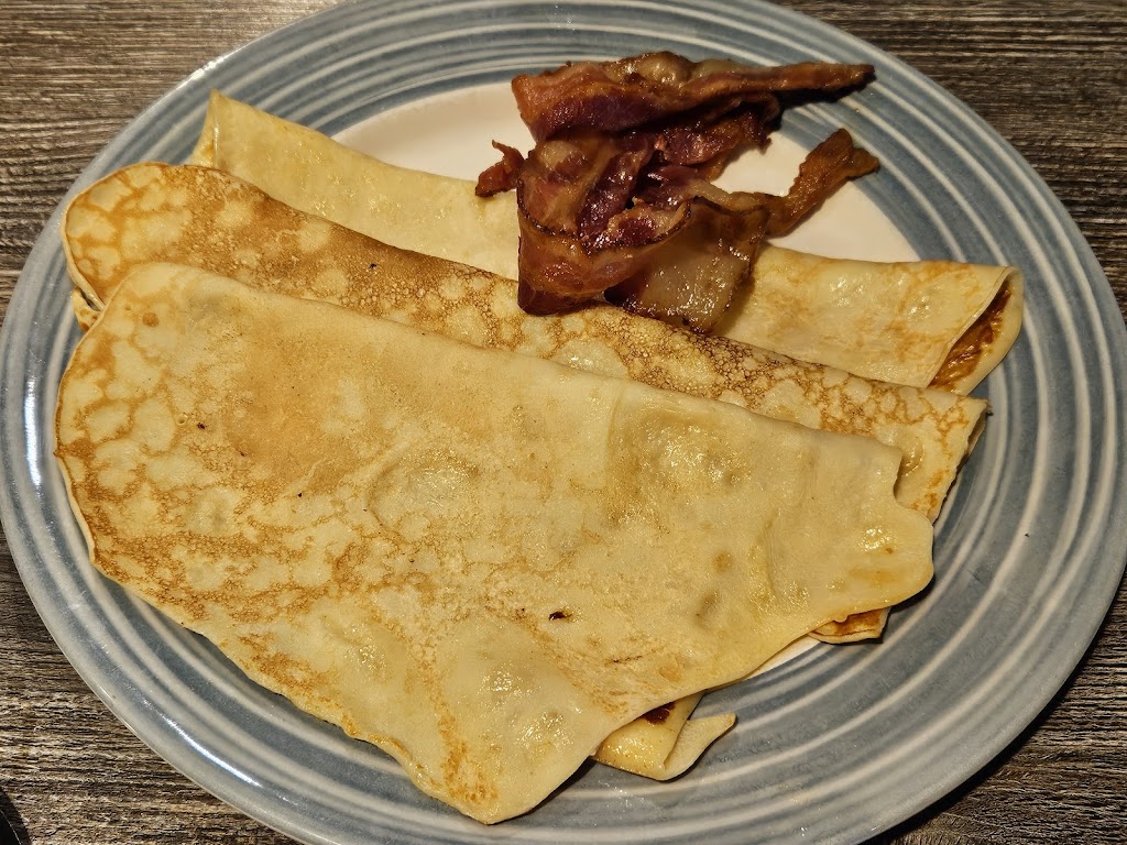 Great breakfast.....I enjoyed the Finn pancakes w berries, while hubby had eggs, bacon, potato wedges & Finn pancake....Delicious! Coffee was fresh & kept flowing!!