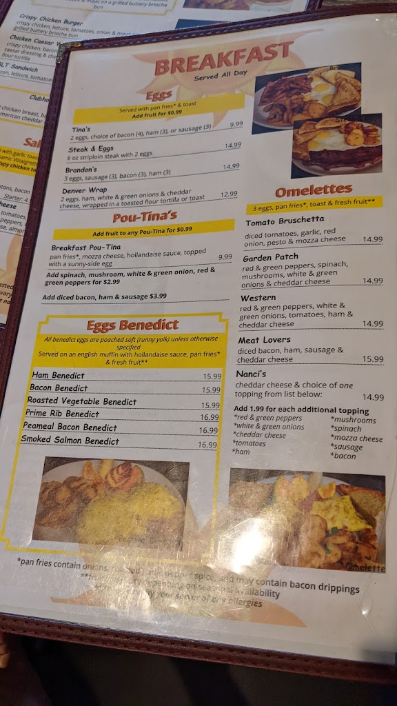 Just landed in Thunder Bay and I was recommended to try out Tina s. I walked in and was immediately seated, and decided on the Steak and Eggs for breakfast. I was initially shocked by how fast it came out, I assumed it probably was sitting under a heat lamp and fully expected it to be dry and bland. Holy smokes I was mistaken!!! I can t believe one of the best steaks I ve had in awhile was at a breakfast/lunch restaurant but it s the truth! I was going to take a photo for the review but I couldn t put my fork down until the steak was gone. The over easy eggs were perfect, and the wedges were great for scooping up the yolk. The staff were super friendly and my server Carter was awesome. The atmosphere felt warm, welcome, and homely. If you haven t been here yet, do yourself a service and make your way over for a bite! Kid-friendliness: Lots of big booths for families, I noticed people have written their names on the bricks which just adds to the friendly, homely atmosphere :)