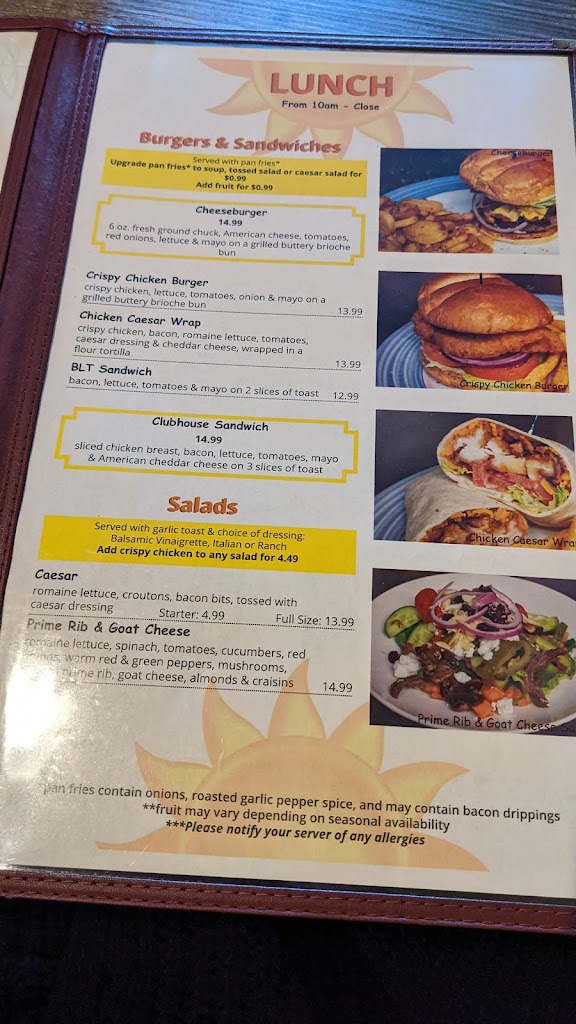 The service was great. Friendly staff. The club sandwich and chicken Caesar wrap were good. I didn't like the potato chips at all. They were hard and dry. Overall it's okay. Prices are very decent as well.