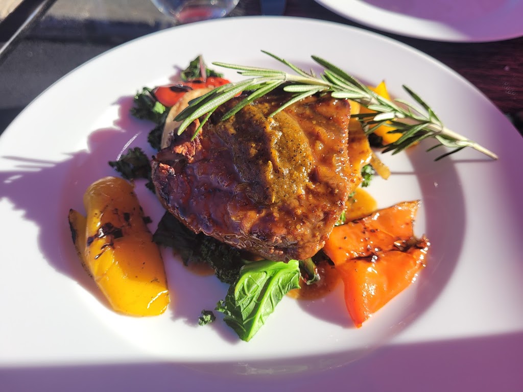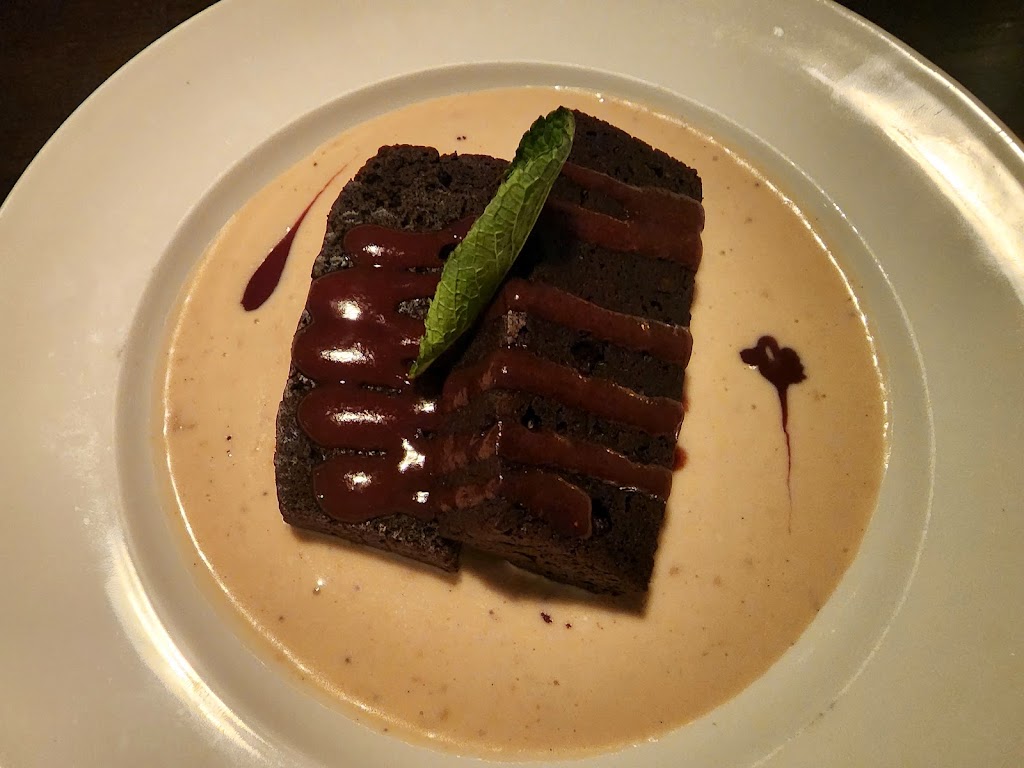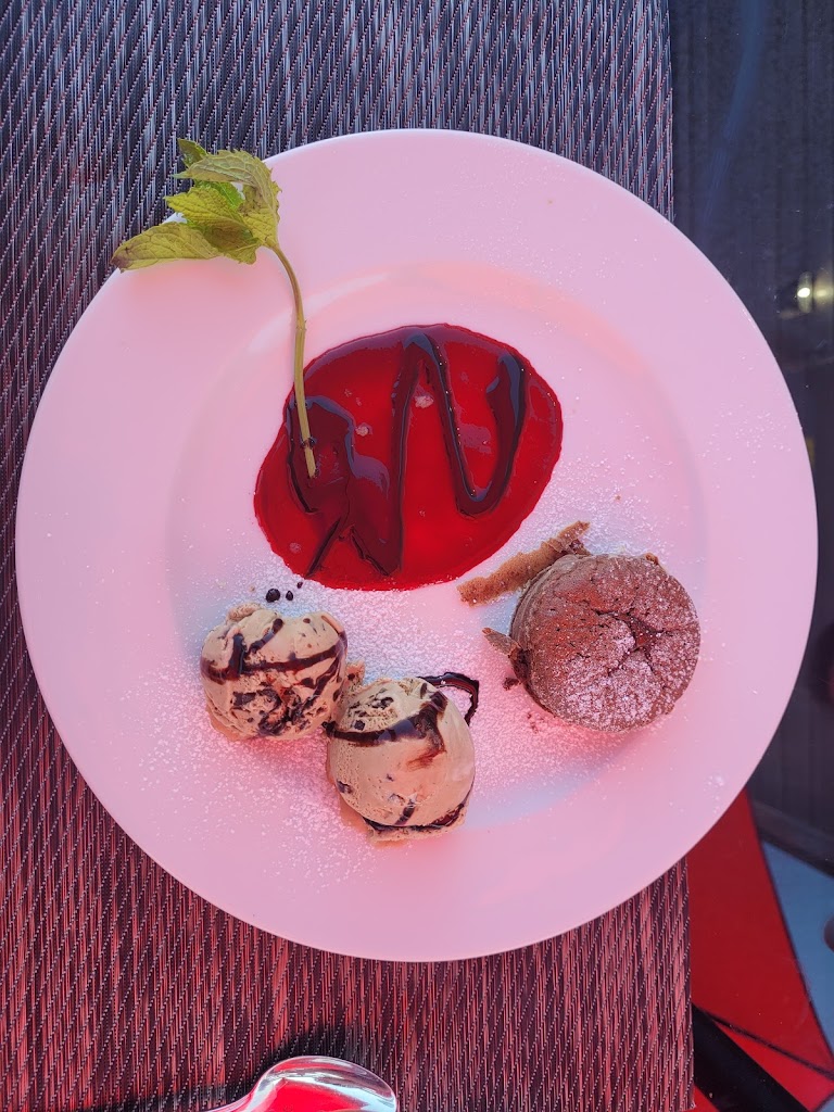 We were led to our table, seated, the gentleman put our napkins in our laps. Next water was served. The glasses were kept full all evening. A small bowl of olives was brought out. Then a basket of bread and a plate with triangle shaped slices of butter and a head of roasted garlic to spread. Delicious. My husband chose the Tempura Battered Jumbo Shrimp Cocktail with tomato/chipotle salsa, spicy Guacamole, Tortilla crisps. He said it tasted amazing. I chose the Crispy Apple Braised Pork Belly with Fennel/Apple slaw, cranberries, pineapple, Pork jus Reduction. What a wonderful blend of flavours. The pork belly was nice and crisp. My husband ordered Rosemary Roasted Rack of Spring Lamb with Gorgonzola Butter, Roasted Potatoes & Vegetables. When asked they recommended Pinot Noir wine with the Lamb. Also that the chef recommends it served medium rare. I chose the Red Wine Braised Beef Short Ribs with Garlic/Potato Mash, Roasted Heirloom Carrots, Port Reduction, Orange Gremolata. Our entrees were cooked to perfection and tasted so good. Then after the plates were cleared, they brought us dessert menus and an after dinner alcohol menu. We were full by now but decided to split Warm Chocolate Gâteau with Raspberry Coulis, Fresh Berries and Cappuccino Icecream. A small chocolate cake filled with warm chocolate on a plate with Raspberry Coulis with Bistro written in chocolate syrup and more syrup drizzled on the 2 small scoops of icecream beside the fresh, strawberries, 2 blueberries, 2 black berries and a sprig of mint. The taste was out of this world. The bill was brought with 2 Andes chocolate mints. What a wonderful night out.