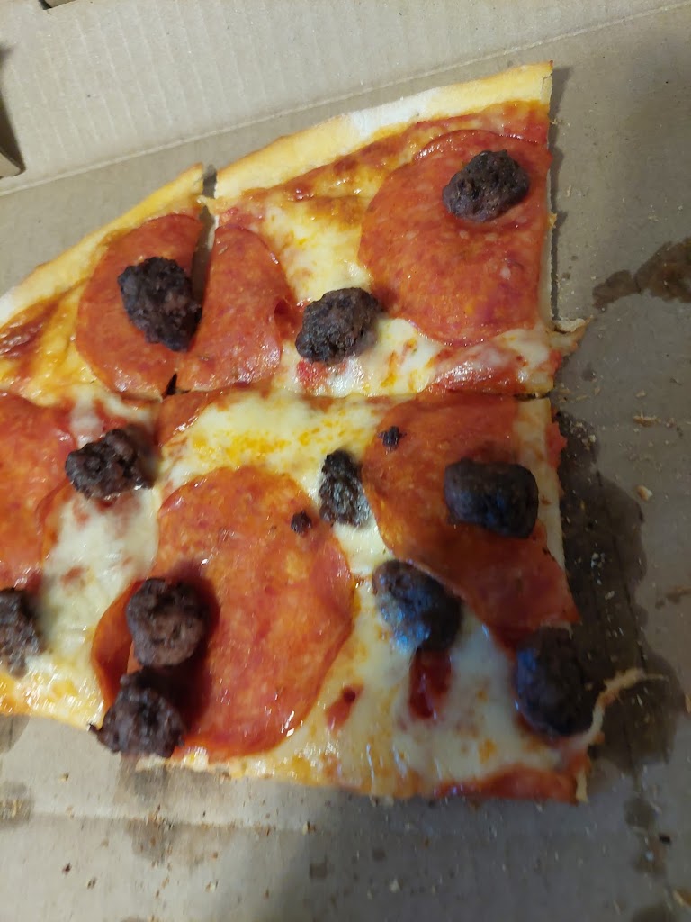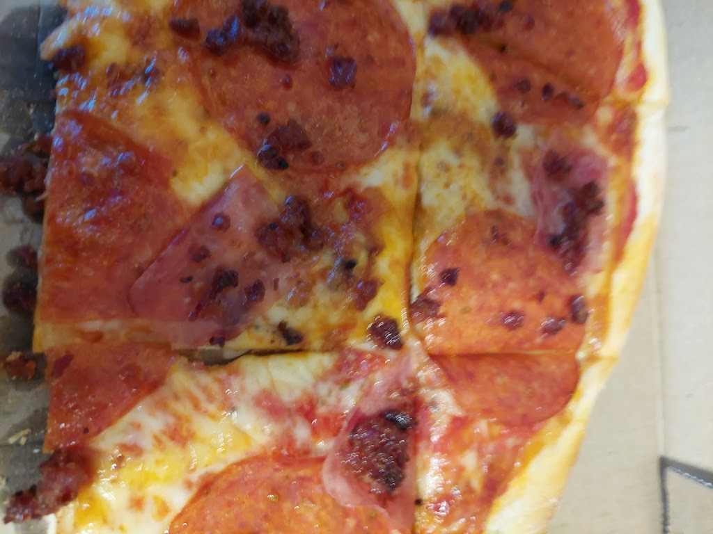 For $50, you expect a decent pizza, but I will never order from here again. I did like it years ago, but they have changed. I don't know if Mama Alfa is still cooking here. She was pretty old when I worked here a couple of decades ago, so I don't think she's still the cook. There's way too much herb in it. No one here liked this at all. It tasted very herby with a lot of cilantro and oregano. The ground beef was little meatballs. The bacon was maybe a tablespoon of dark brown crumbs. You have to look really hard, but you will see the lunchmeat style "ham" that they use on top of the bologne type pepperoni that they use. The crust was overcooked to burnt in places. One of the pizzas was swimming in sauce (which is disgusting), while the other was ok.