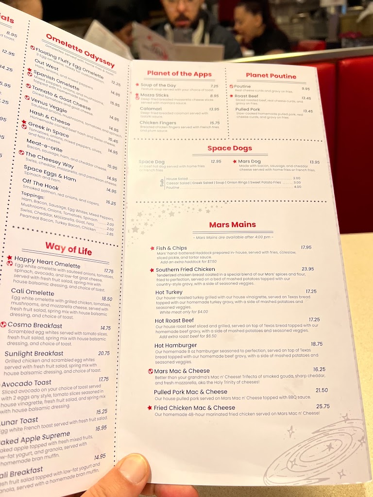 I havent visited Mars Diner in a couple of years and the food still tasted great and was served on plates that were as big as I remembered them being. Despite being so busy that there was a line out the door and onto the sidewalk, the waiters were all very courteous and came back to check on how my friends and I were doing or if we needed anything. Solid recommendation for anyone that loves all day breakfast food and more!