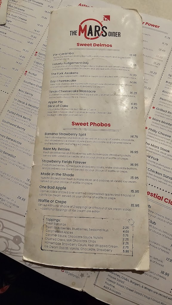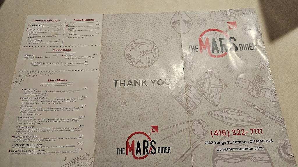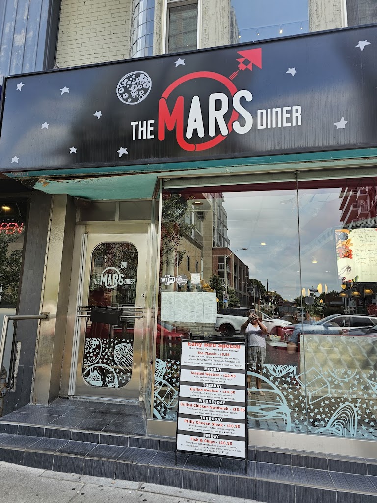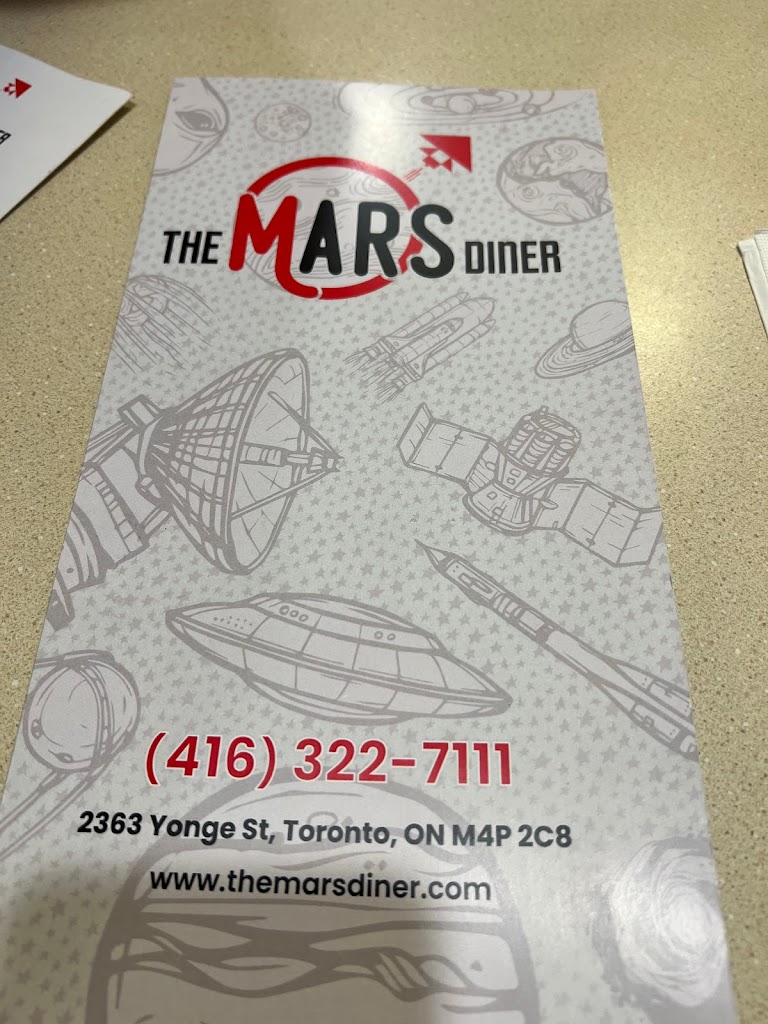 Mars Diner: A Timeless Gem on Yonge Street Nestled amidst the bustling cityscape of Toronto, Mars Diner stands as a culinary beacon, offering a timeless escape into the heart of classic American dining. With its iconic red booths, checkered floors, and vintage signage, Mars Diner evokes a nostalgic charm that transports patrons to a bygone era. The menu at Mars Diner is a testament to the diners enduring appeal. From hearty breakfast classics like fluffy pancakes and sizzling bacon to juicy burgers and crispy fries, theres something to satisfy every craving. The diners commitment to quality ingredients and generous portions ensures that each dish is both comforting and satisfying. Beyond the delectable food, Mars Diner is renowned for its warm and inviting atmosphere. The friendly and attentive staff make diners feel right at home, providing a personalized and memorable dining experience. Whether youre seeking a casual meal with friends or a cozy spot to enjoy a solo breakfast, Mars Diner offers a welcoming ambiance that is sure to leave a lasting impression. In conclusion, Mars Diner is more than just a restaurant; its a cherished institution that captures the essence of classic American dining. With its delicious food, nostalgic atmosphere, and exceptional service, Mars Diner is a must-visit destination for anyone seeking a taste of the past in the heart of Toronto. 2363 Yonge St, Toronto, ON M4P 2C8