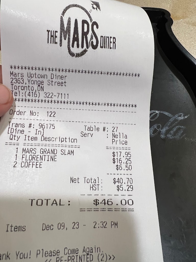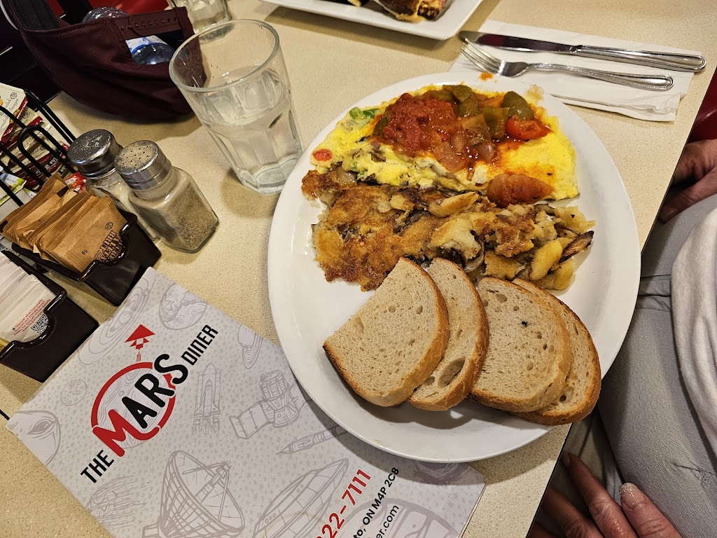 This place is your classic all American diner! I loved the look and feel of the place, most diners, although lovely, can feel really dingy. This place gives you that exciting classic diner feeling, from the booths, to the lights, to the cups, to the uniforms! I loved this place. I walk by it all the time, and it s always either full, or has a line coming out the door. Lucky for us, we were able to get seated very quickly. Service here is friendly and prompt. The staff are efficient and very kind and patient. The menu is huge, so prepare yourself for some amazing options. When I see a huge menu, I often worry that the food won t be great, because why are they making so many different things? But not at the Mars Diner. The food was phenomenal. And yes, it was classic diner food, but wow it was delicious. I ordered the southwest Benny sandwich, and an iced coffee with vanilla syrup in it. The iced coffee was great, I really enjoyed it. The food was also delicious. It was cooked perfectly, the salad was simple but tasty, and the home fries were classic and delicious. I loved the chipotle sauce and peameal bacon on my Benny, it also came with sautéed onion and mushrooms, which added the perfect touch. My partner ordered the mars mountain sandwich, which unfortunately wasn t what he expected (he misread the menu and didn t realize all the food would be layered on top of each other with the meats being chopped and mixed with the eggs). However, despite that, it tasted fantastic and he enjoyed the whole meal. This place does diner food fantastically, and it s no wonder it s busy all the time. I can t wait to come back here and try something else off of their menu.
