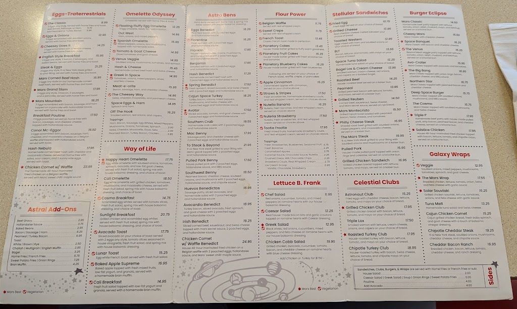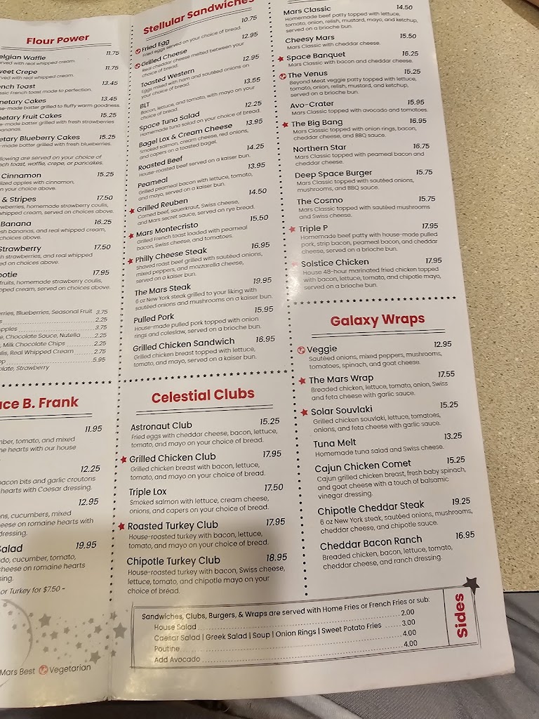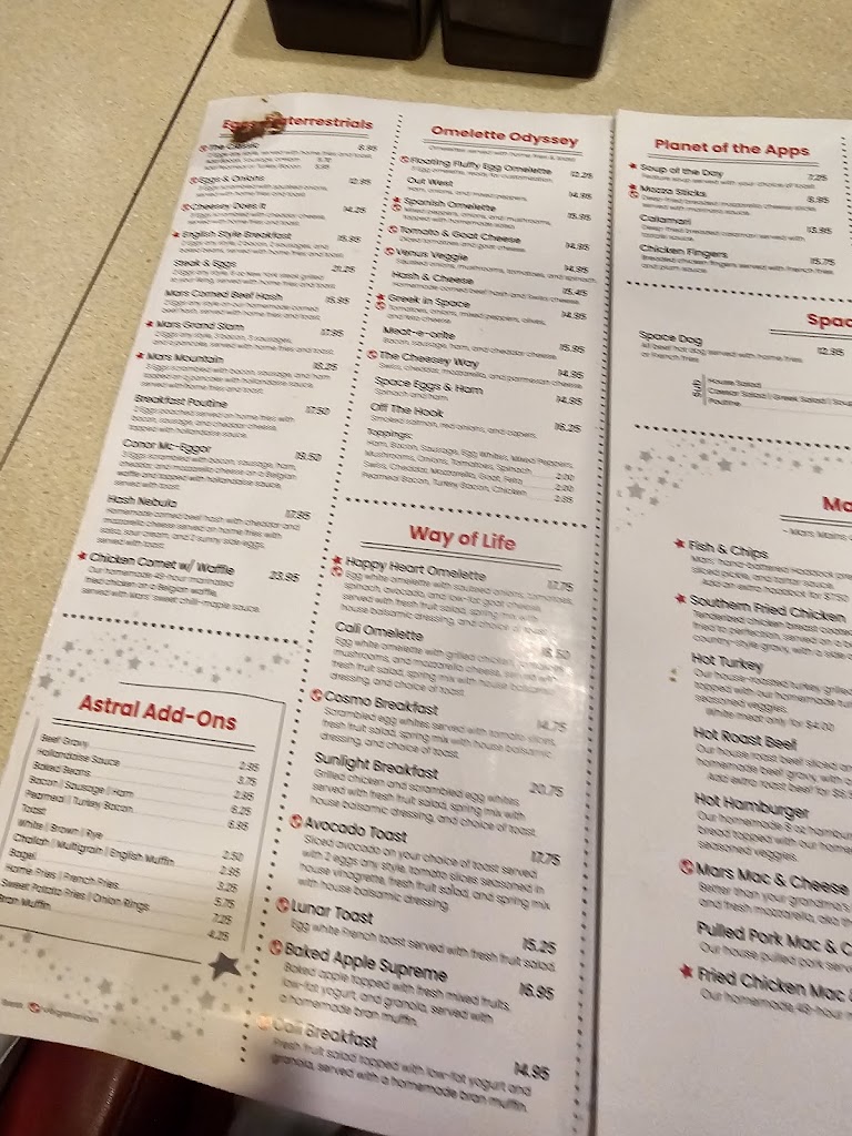 Went for Sunday brunch at Mars Diner! Had to wait a few minutes in line to be seated, but our food came out very quickly once we got a spot. I enjoyed my omelette and the fun vibe of the place! I will come back again, maybe to try some of the fun dinner options I saw on the menu!