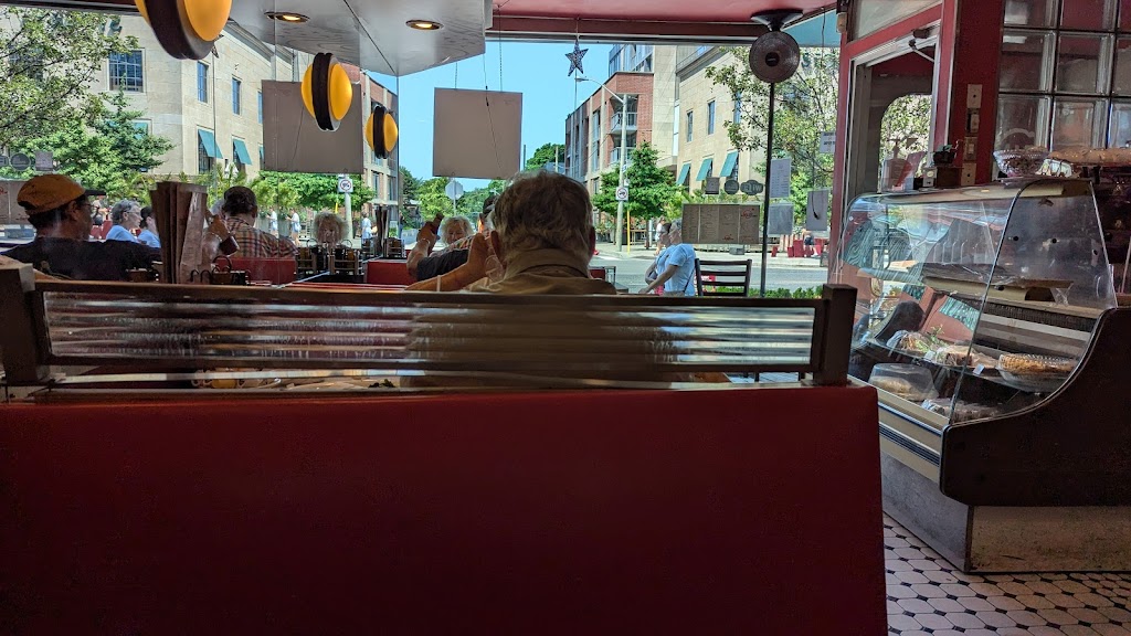 Mediocre diner style food in a faux-50s style room, crammed booths, refills of properly watery diner coffee. Menu leans mostly into breakfast options, with a few wraps, burgers and sandwiches. I had a cheeseburger which was tasty but overly mayo laden and impossible to eat. Fries were limpid and seemed leftover from an earlier order. No kids menu. Noisy and not terribly family friendly. Service was pleasantly harried. Wheelchair accessibility: Not accessible