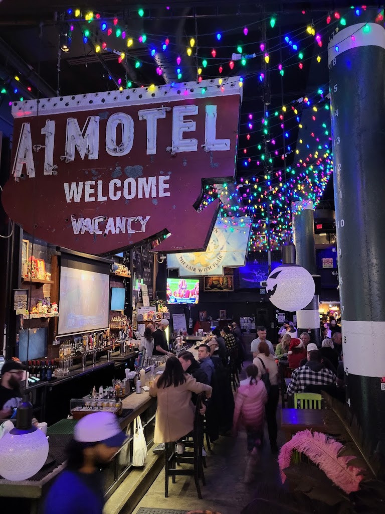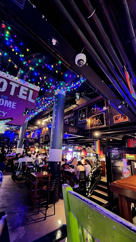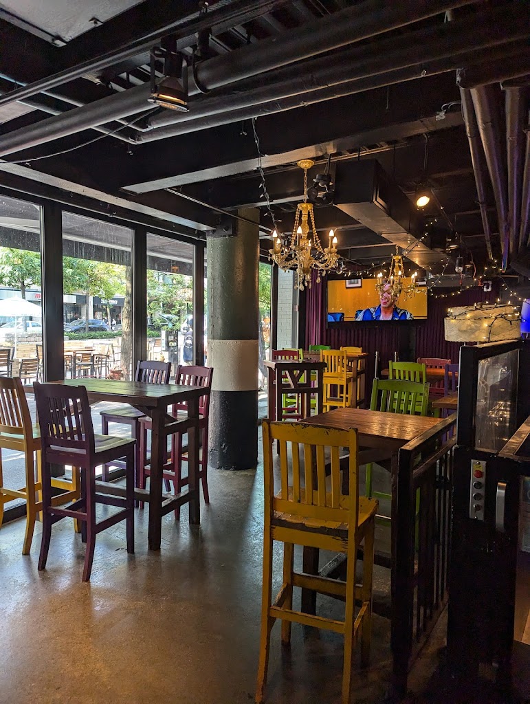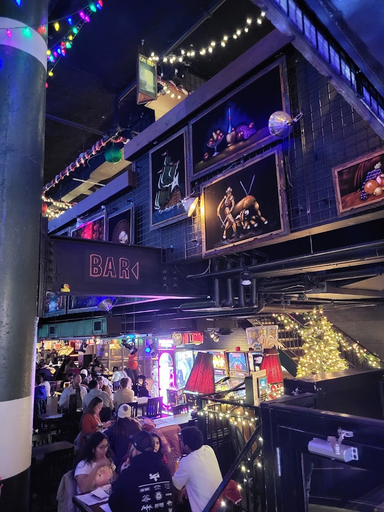 A large, colourful, and fun bar. Games, a basketball court, etc. make it a fun spot for dates or groups. Great selection of beer and drinks. The chicken was very good. Juicy and delicious. Our bartender was friendly and attentive and looked like a sexy rock n roll Santa.