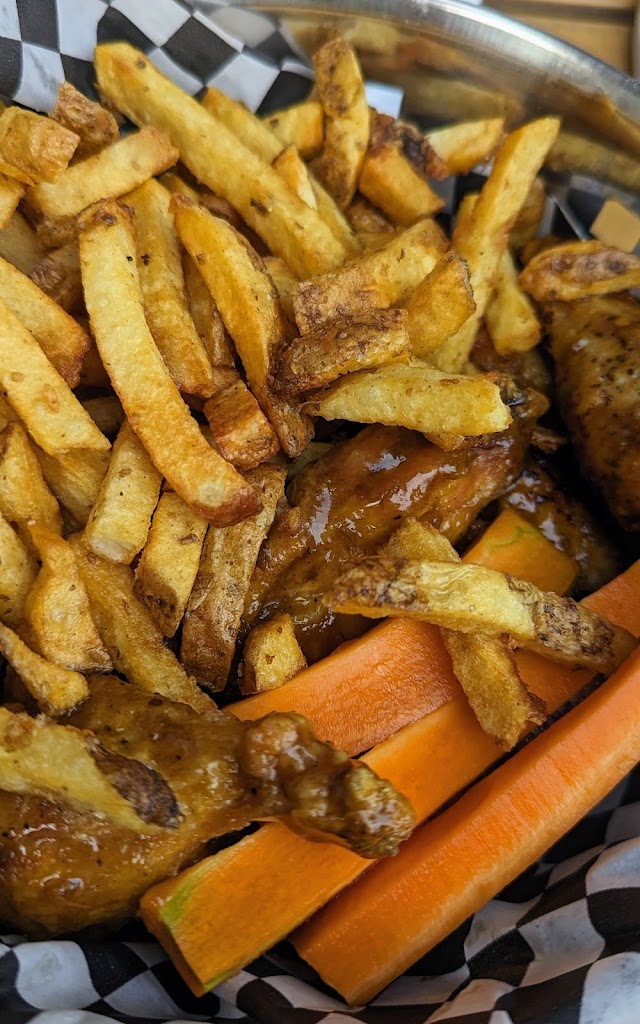 Got take out. Wings were good. But Fries: didn t give ketchup Sweet potato fries: sauce tastes like pumpkin spice and is gross. Dip for veggies and 4 pounds of wings: didn t ask what I wanted and gave 4 dill sauces when blue cheese was an option. Thanks for giving me sauce I didn t want. Details REALLY matter with food and you should have better focus to present all the options to the customer.