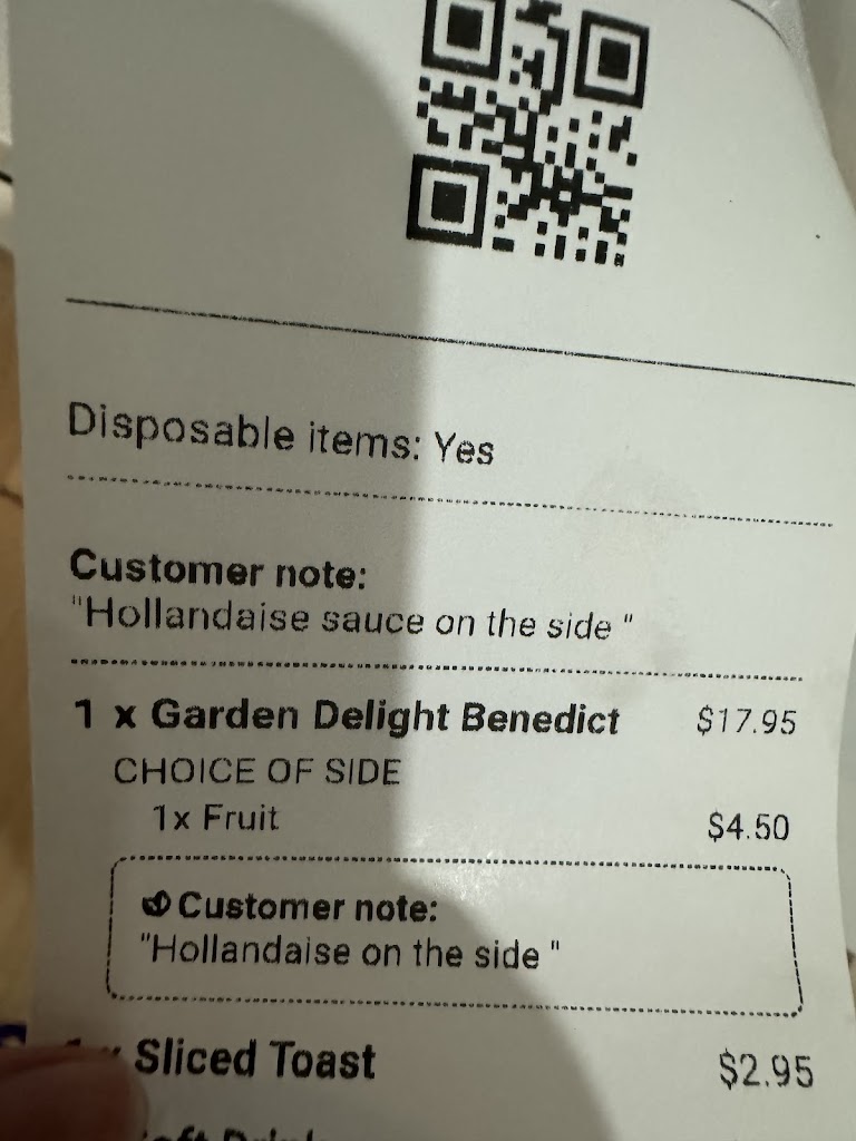 Asked twice for Hollandaise sauce on the side and it was still on the eggs. Can’t get a refund from Uber….