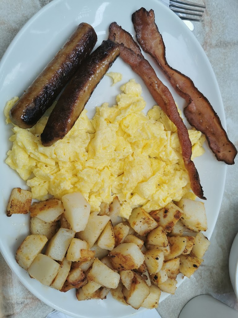 What a gem of a greasy spoon for breakfast! This place had great tasting breakfast for a really affordable price. I ordered the breakfast skillet and it was delicious. Don’t mind the photo it had a number of bites already taken before I remembered to snap a shot. My partner had their three eggs, sausage, pancakes, and home fries and it was such a filling plat of food for the price. All in all it was a great experience.