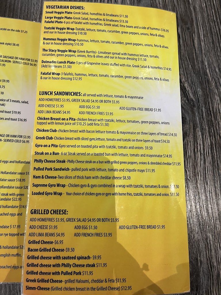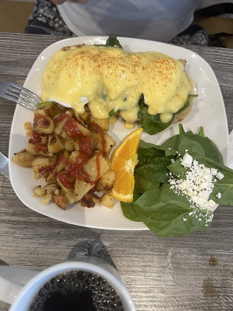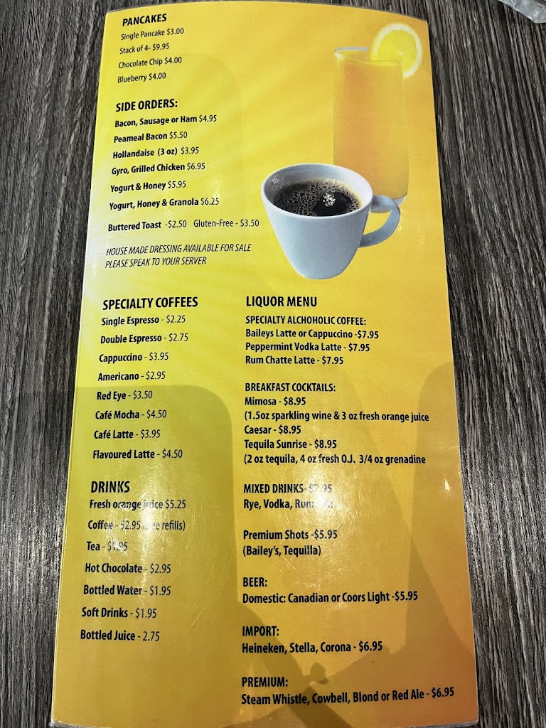 Literally just finished breakie , wish I had of taken pictures. We had a Greek Potato Omlette with a cappuccino, amazing flavors ! My partner had canadian eggs Benny and a reg drip coffee...for him to say he liked the coffee speaks volumes! The sauce was perfect and the eggs done just enough ! For myself and him for breakie 39.00 -thats a steal The staff was attentive and the food was super quick! Highly recommend