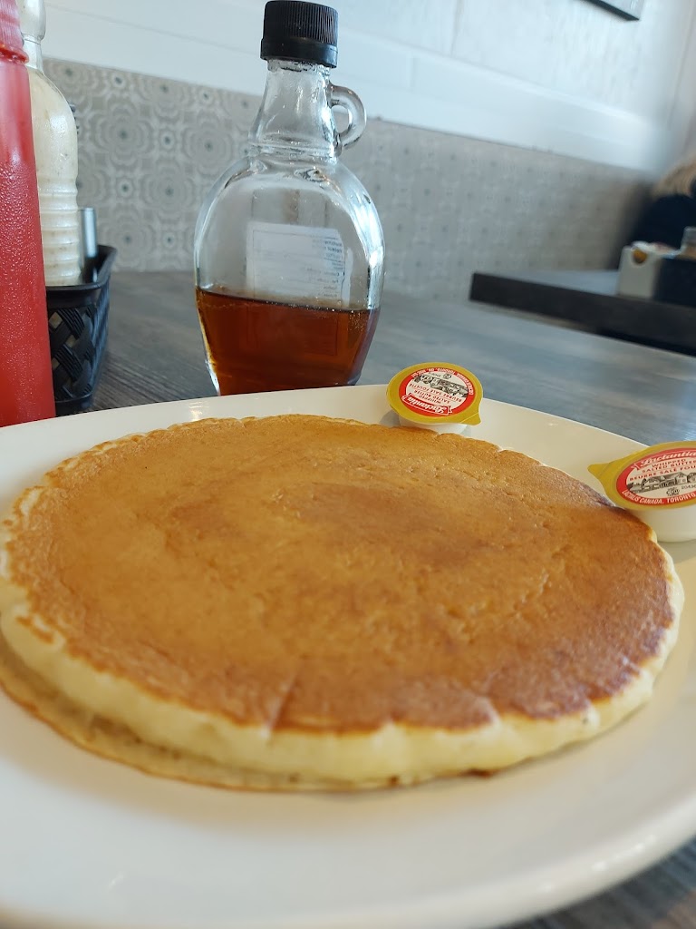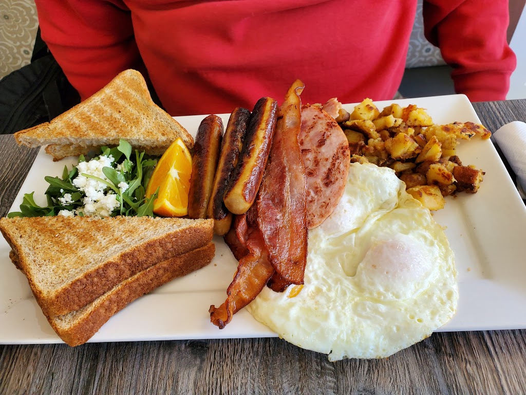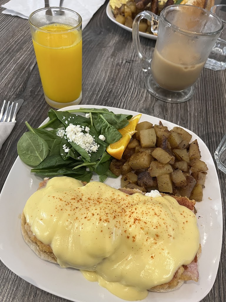 My fiancé and some friend of ours came together to check out this brunch spot and everything was fantastic! Firstly, I would highly recommend calling them during their business hours to make a reservation at least day before (they don’t take same-day reservations). We made a reservation for a Saturday and there was already a line outside the door when we arrived at noon. The restaurant itself is small but nicely decorated and cozy. There is bronze decor and plants scattered throughout. The chalkboard and fun little signs such as “Be Our Guest” add some flair. I got some freshly-squeezed orange juice and the Canadian Benny. It was SCRUMPTIOUS! The Hollandaise sauce was divine on top of the bacon and the eggs were perfectly poached with runny yolks. The freshly-squeezed orange juice was so refreshing. My fiancé got the Build-Your-Own-Meat-Lover’s Breakfast. Everything was piping hot and delicious. His eggs were scrambled to perfection and the sausage was especially flavourful. We also got their pancakes which were delicious and fluffy, and their gyro which was super tender and flavour. All in all it was a delectable brunch feast! You could tell the staff were working extra hard and the customer service was top-notch despite the how hectic and busy the restaurant was. We really appreciate their efforts! I highly recommend this terrific brunch spot for your next stop!