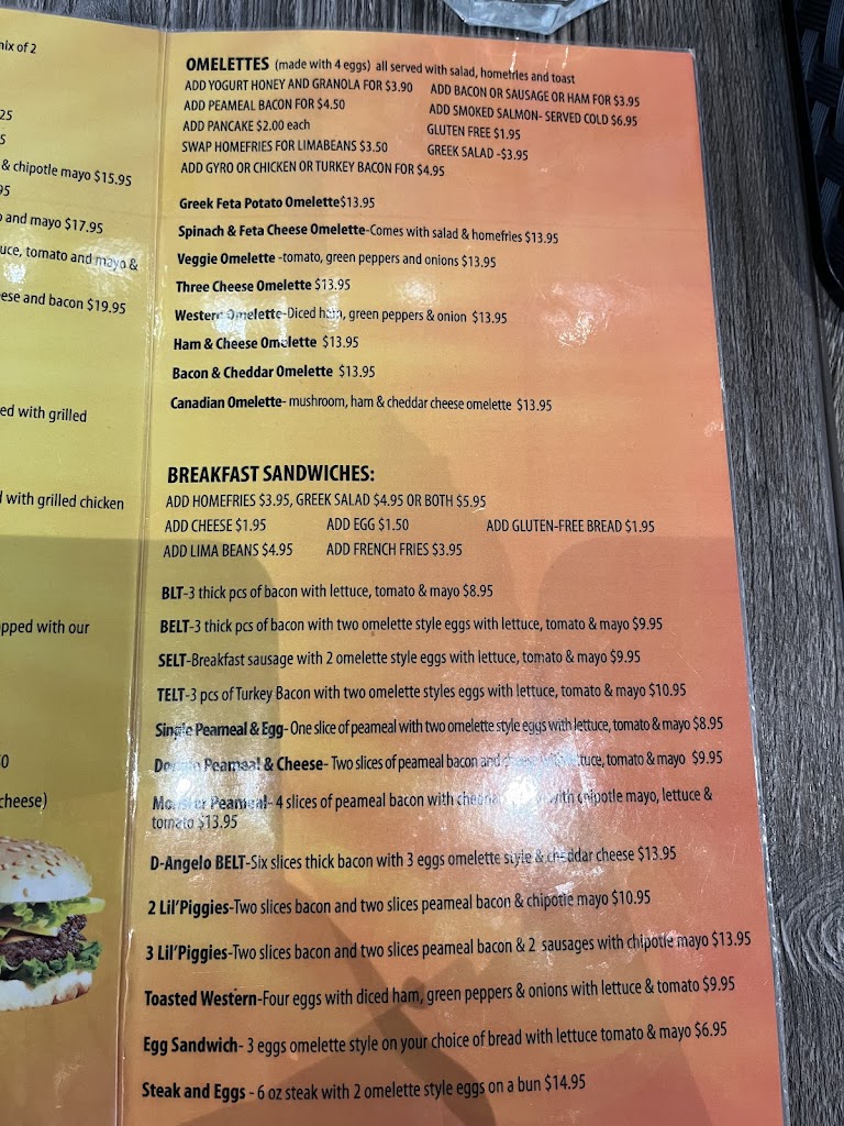 A pretty good diner with a homey feel and nice greasy diner food as youd expect. Staff are friendly and food is very reasonably priced with pretty good portions. Massive menu that ranges from breakfast items to sandwiches, and even Greek food (owners are Greek apparently?) Definitely recommend for a nice low-key breakfast, brunch, lunch, or even dinner and when youre looking for a good no-frills meal that wont break the bank. I had the D-angelo BLT on rye and the 6 thick cut strips of bacon were crispy and flavourful! It was really good. Home fries were sort of griddle fried potatoes (not deep fried) and Greek salad was pretty good. Friend had the big breakfast and it looked really good too.