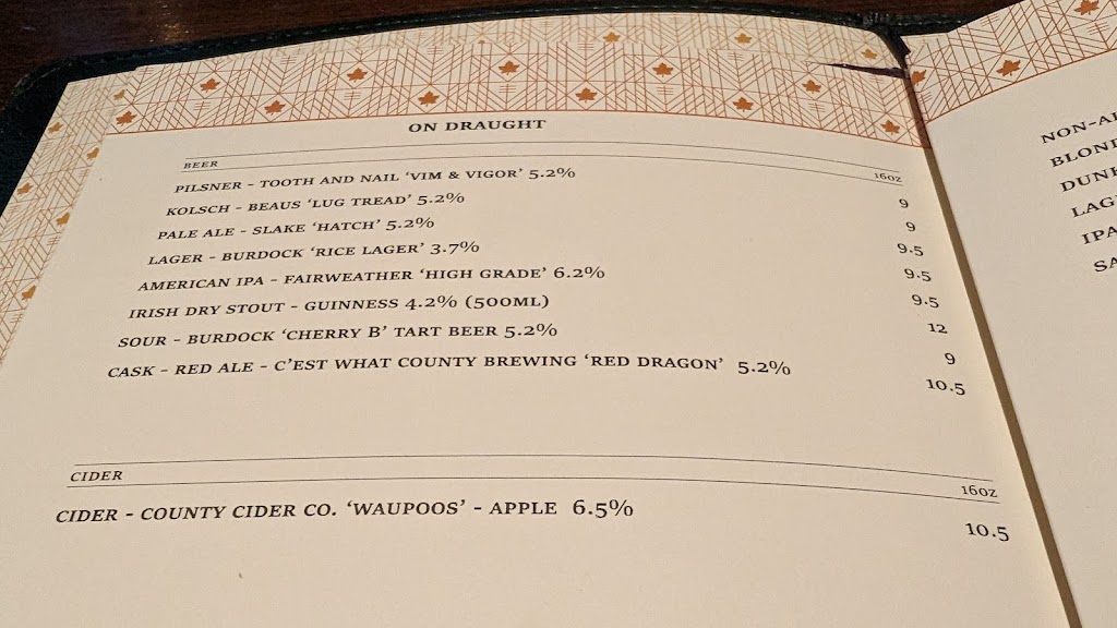 Beautiful atmosphere, great staff and delicious food. Vegetarian options: Being a Tavern which typically focuses on meat centric dishes, they have lots of sides and two mains that are vegetarian friendly. Dietary restrictions: Dairy can be removed where necessary