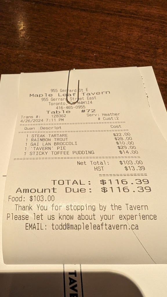 My husband and I had a great time at Maple Leaf Tavern. Great food: lobster cavatelli, aspargus, halibut, brussels, and rhubarb pavlova as a desert. Woww, everything to die for! I had Paloma fresca as my drink . Amazing environment, and Heather was our waitress, who was very helpful and knowledgeable. Its worthy every penny.