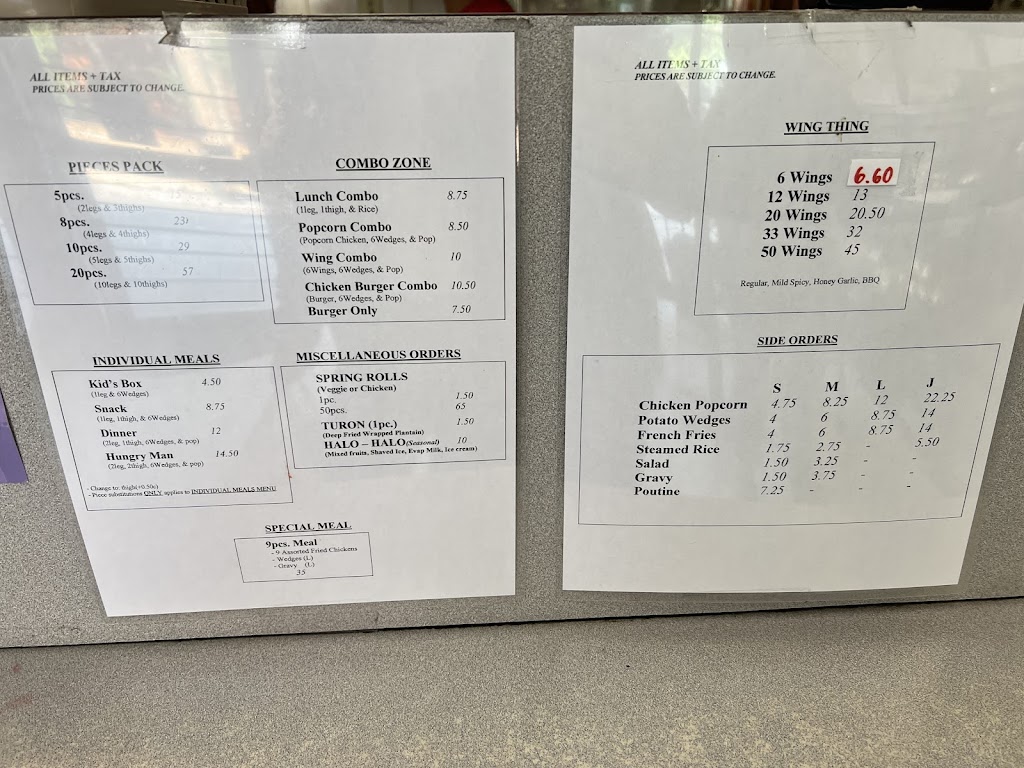 Some updated menu. Missing a lot of the menu. Good options and combos. Very good fried chicken. Popcorn chicken is great. Portion is great. Price is great. Gravy is pretty good. The wedges could be a little crispier!
