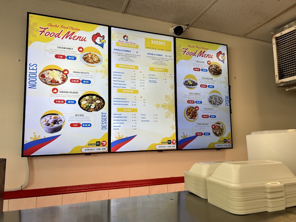 Amazing value for tasty crispy chicken! The medium box of popcorn chicken (my choice of the day) is under 7 dollars and include a large amount of chicken! If you are having people over for a games night, get a large box or get a whole rotisserie chicken combo! They also have great chicken adobo and pancit. The menu is visible and easy to navigate with demo boxes to show you the different take away sizes ! If you happen to have any questions, ask the friendly staff at Chae Chester. FYI: This is a take away spot and doesn t have any seating.