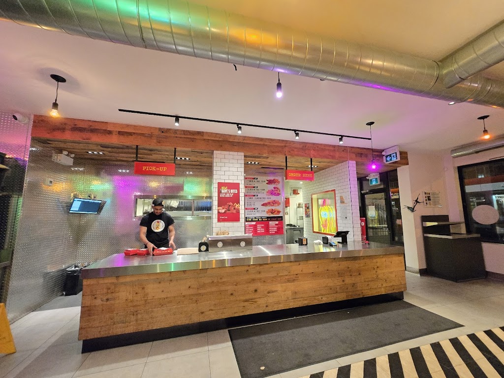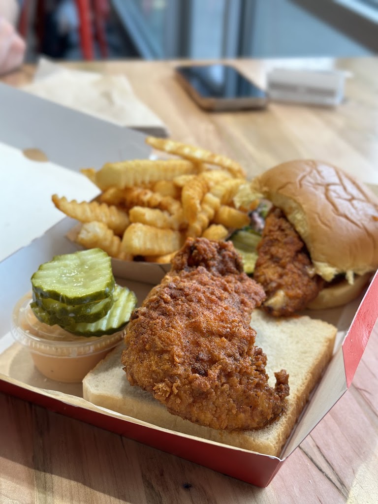 Chicken is tasty, hot sauce has nice flavour. Fries and sauce work well with chicken sliders. Very loud music inside so consider eating outside if thats not your thing. Wait times are also long due to made to order meals, which are quite expensive for the small portion of food. Expect to pay 20 dollars for a basic sandwich and fries.