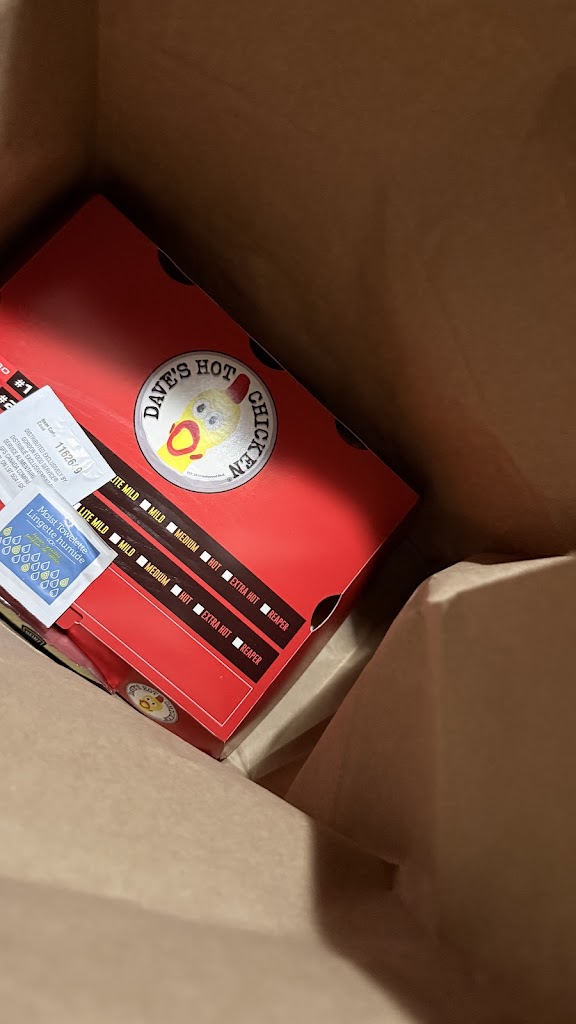 This one is the worse dave s hot chicken in the town. the meat was too small and more than half of it was burnt. does not look like the one in the photo I do not recommend