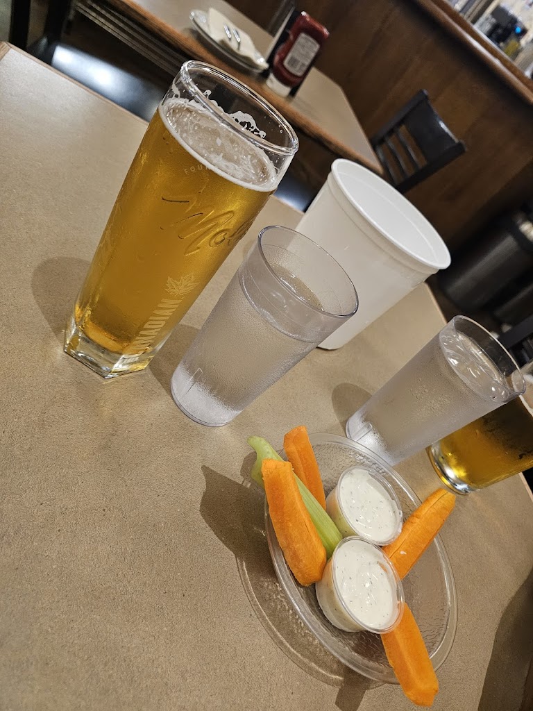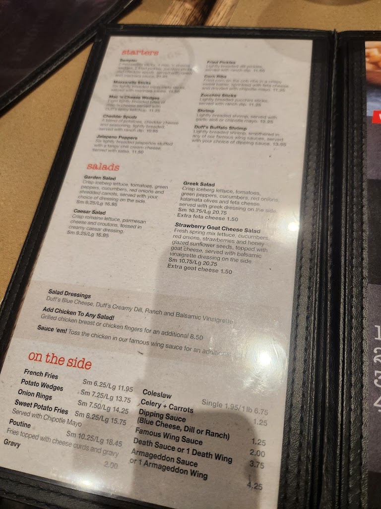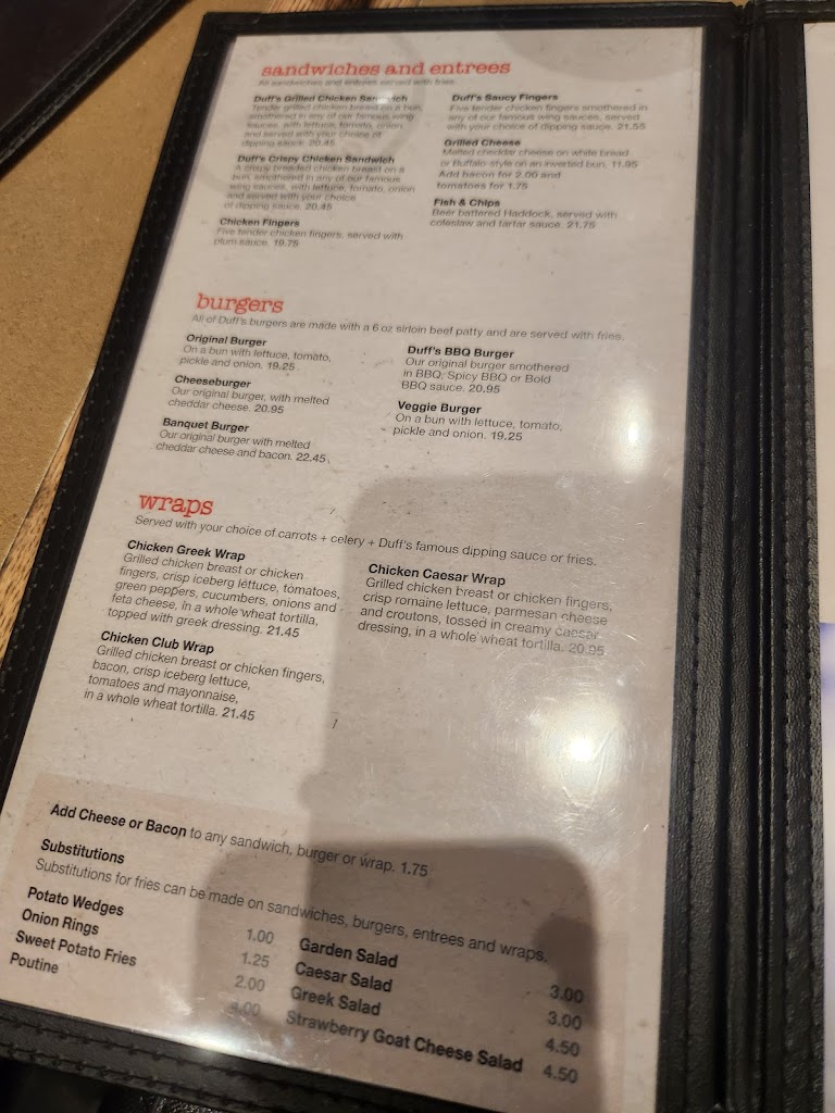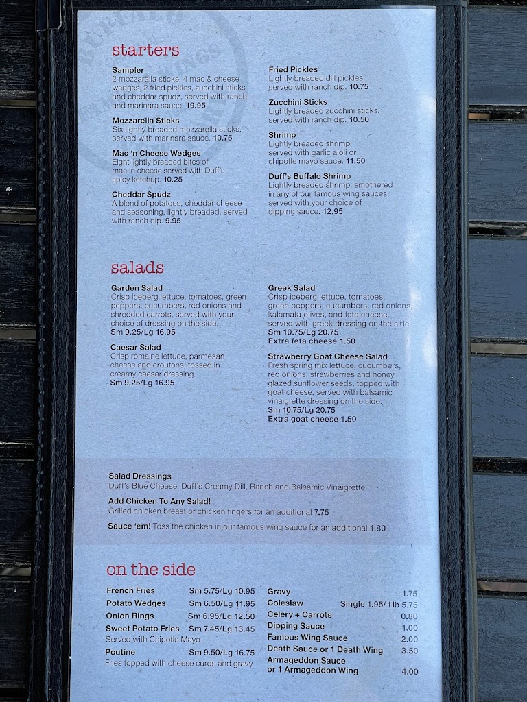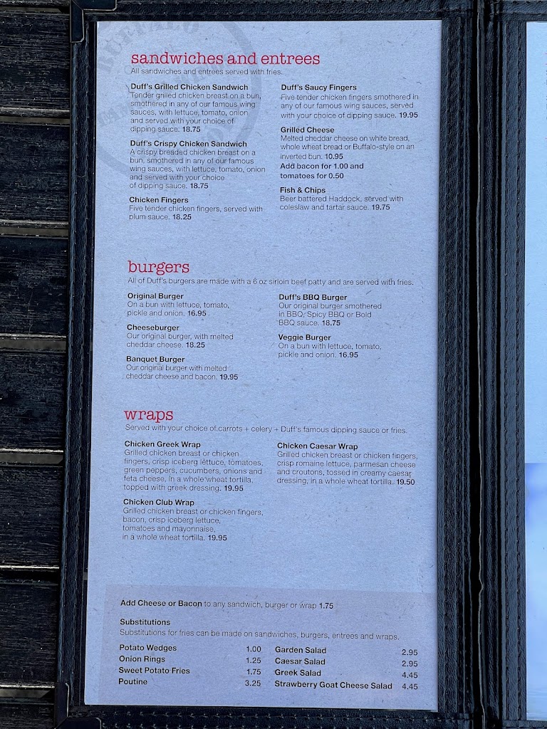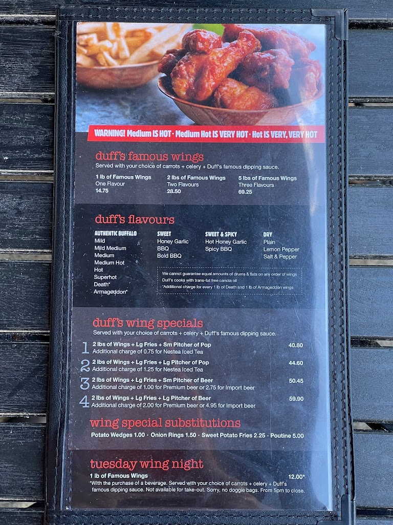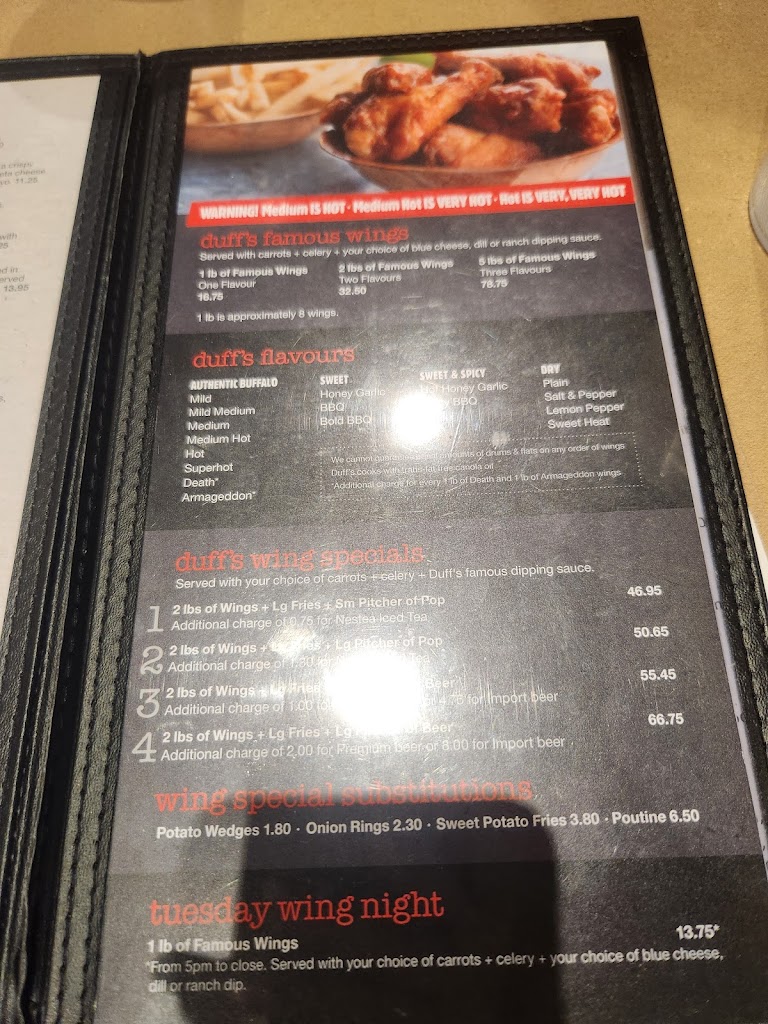 The wings have been going downhill since I ve started going there the last 20 years. The first few times they were great wings juicy full of flavour and fresh. Then they started to get smaller, some places call the bistro wings less meat more skin( I accepted that). Next they got drier, the wings must have been fried already then re-fried when ordered and sauced. We still went back to have wings ( great coleslaw btw) to support local business plus the owner was nice from time to time. When COVID lockdown hit we did takeout and dine in when we can. The last straw was when we ordered a take-away when I got home we were missing the vegetables and dip. I call them right away and let them know, kind of expecting an apology and a credit of sorts for the next time. Boy, what a let down. The hostess that answer said ´that s not possible ´ no mispacking here. We asked to speak with the manager, he then said he had checked with the kitchen and no mistake. By this time I m thinking, if you people actually checked our history you can see we been doing takeout quite often. We were about to just hang up and leave it be, but then the lady on the phone said in a matter of fact tone the veggies and dip just comes with the meal it not like you paid for it. That was was the last straw we have not visited Duff s since that day.