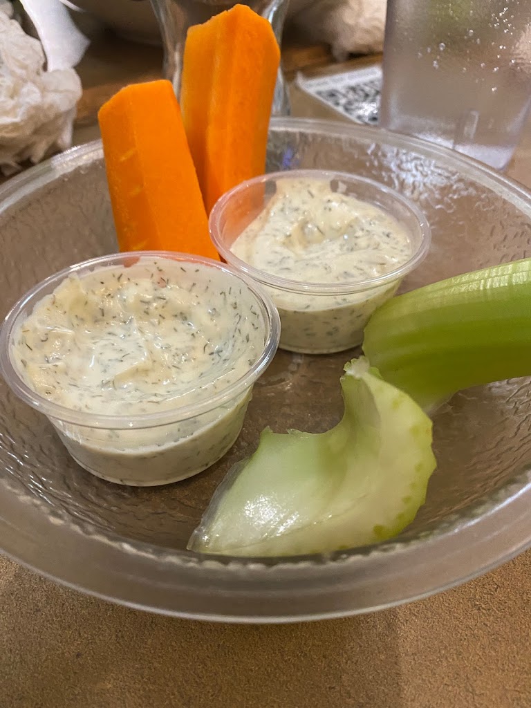 Got 2lbs wings and a strawberry salad. The salad is good. But the wings are super dry and overcooked. What shocked me was the 2 sticks of carrots and 1 stick of celery. It really doesnt cost that much to give a little more veggies.