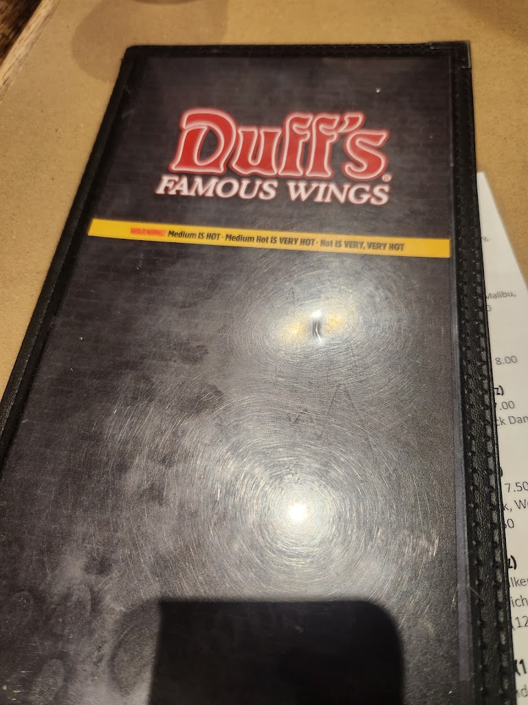 Extremely average experience. I heard a lot of good things about Duff's wings from a friend but the food definitely was a disappointment. The service was ok but the server seemed to be in a bad mood. The wings, although a good size were dry and had little to no flavour. The potato wedges and onion rings were good. The dips were a bit bland. Was expecting a lot more.