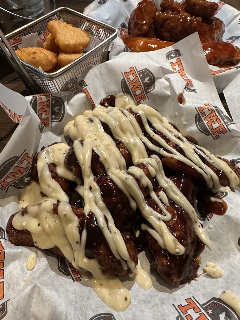 Ordered here on Friday night. Huge selection of flavors, large sized wings and great quality. Also tried the deep fried cheese curds, which due to takeout didnt travel well and likely wouldnt get again. Its located where Queen Schnitzel used to be, overall narrow interior with a few tvs to watch the game (although i ordered takeout). Service was great during pick-up and will definitely be ordering again. To the owners: Id clean up the user interface when ordering through ubereats as it was difficult to select flavors in a multi pound order. Otherwise keep up the good work