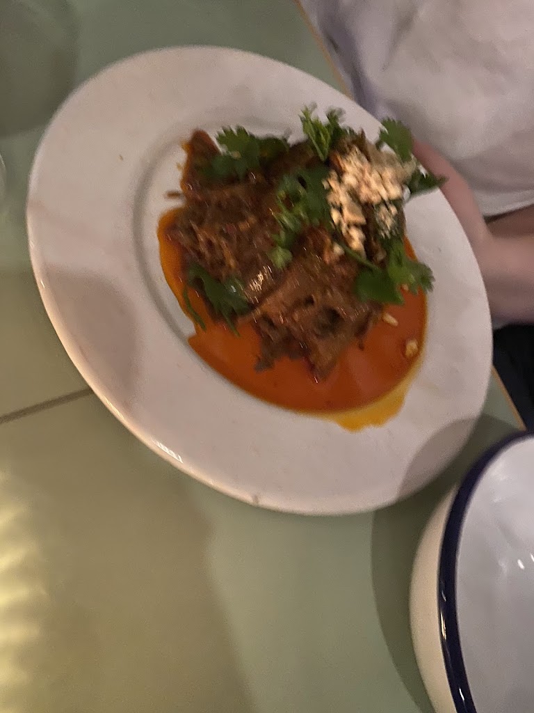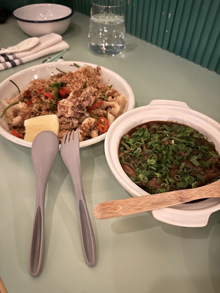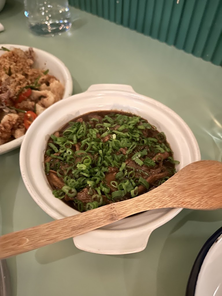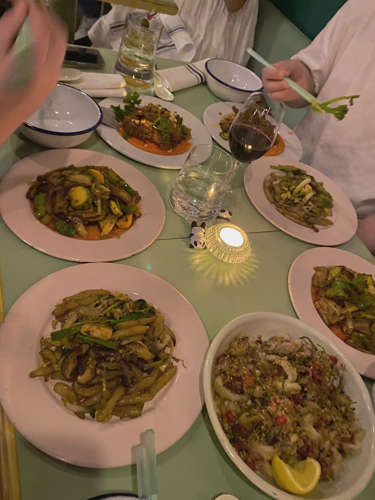 i really enjoyed most of the dishes we ordered here. i grew up on chinese food, and have had twice cooked pork before, so i was surprised and impressed by how elevated their version is. it had a good amount of spice, the pork was tasty, and even the vegetables were so so good. i also really enjoyed the tiger salad which was tangy, fresh, and the perfect blend of vegetables. the soft serve was creamy and hk milk tea flavoured which i love, and paired really well with the crunchy coffee bits. our waitress was super friendly and attentive as well ! i was a little disappointed with the dan dan noodles, as i couldnt taste much spice and the noodles werent as chewy as id have liked. however, the rest of the dishes, nice atmosphere and decor, and great service more than made up for it and id definitely come back again