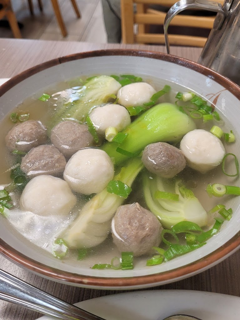 We were exploring Chinatown the other day and saw two men tossing noodles 🍜 at the window in the old fashioned way. We decided to come back another time. It was a late lunch on a suddenly cold Sunday. Just the moment I was almost turning into this place, two groups of customers cut in front of me. Imagine those drivers turning into your lane in front of you without indicator on. Good sign for good food, though, I guessed they were desperate! It took us almost half an hour to get a table for two of us. While waiting, I asked the waitress what tasted good. She said everything! There were also old news articles hanging on the wall near the entrance area, which were quite interesting. I was inspecting the man who cooked noodles. I decided to try their brisket - they called it Beef Stew, though, on the menu. You had to write your own order here. Perhaps, it was a thing for Chinatown here. Same for another place we tried a few days ago. We had Beef Brisket and Tendon Rice Flat Noodle Soup. The brisket was exceptional - tender and flavorful. Rice flat noodle was a bit soft, which I preferred - slightly overcooked. Four kinds of Balls Noodle Soup 🍜 the noodle itself is exceptional. I hadn’t had such great noodle for long time. It was thin, perfectly cooked, still a bit crunchy, and tasteful of egg. The balls were alright. The fish balls were a bit too fishy for me. I would suggest to have the noodle as it was to taste the broth and noodle first, then added a bit chilli oil afterwards. I also liked how the veggie that came with the noodles were perfectly cooked. We will definitely come back next time we are in town!