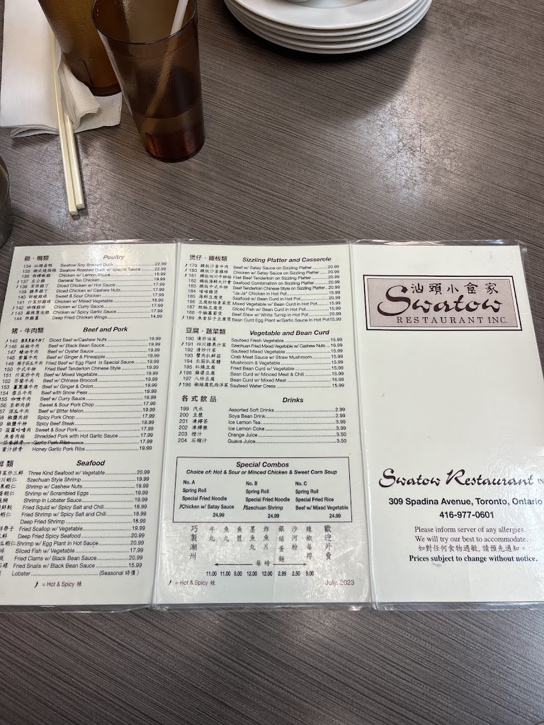 Sawtow Restaurant in Chinatown has a few notable aspects, but overall, it falls short in key areas. The first thing that stood out was the unfriendly staff, who seemed more focused on an eat, pay, and leave mindset than providing good customer service. Unfortunately, the food didn t make up for it the dishes lacked authentic flavors, and the duck was so chewy that we couldnt finish it. On the brighter side, the complimentary green tea and fortune cookies added a fun touch to the meal. However, the overall experience left much to be desired. Parking: Spadina is a busy street to even secure street parking, so plan it ahead to walk a distance.