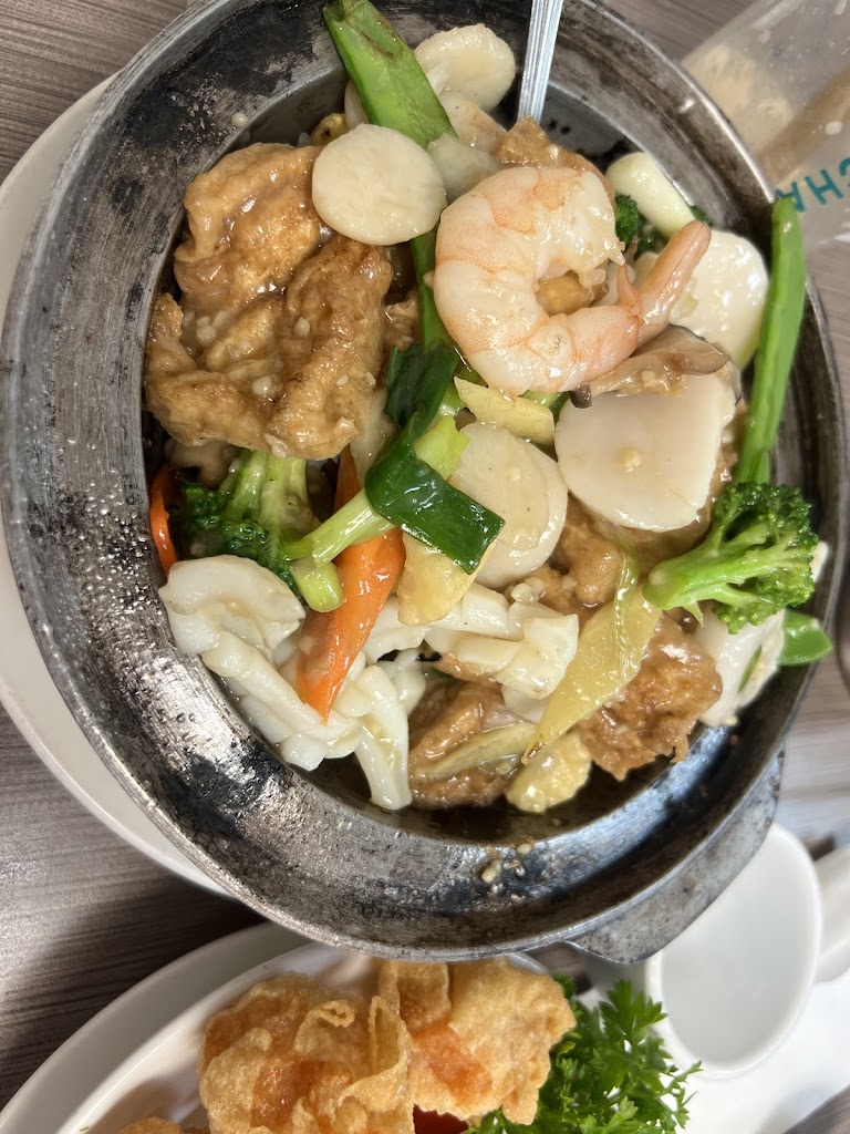 This place is a tourist trap, not a hidden gem. Prices are more expensive than the surroundings. However, they use frozen seafood. I had the seafood pot and fried shrimp balls. Dishes came out fast, in 5 minutes, but the restaurant was almost full (about three open tables). The dishes did not come with rice; an extra $3. Service is so-so. The interior is cramped.