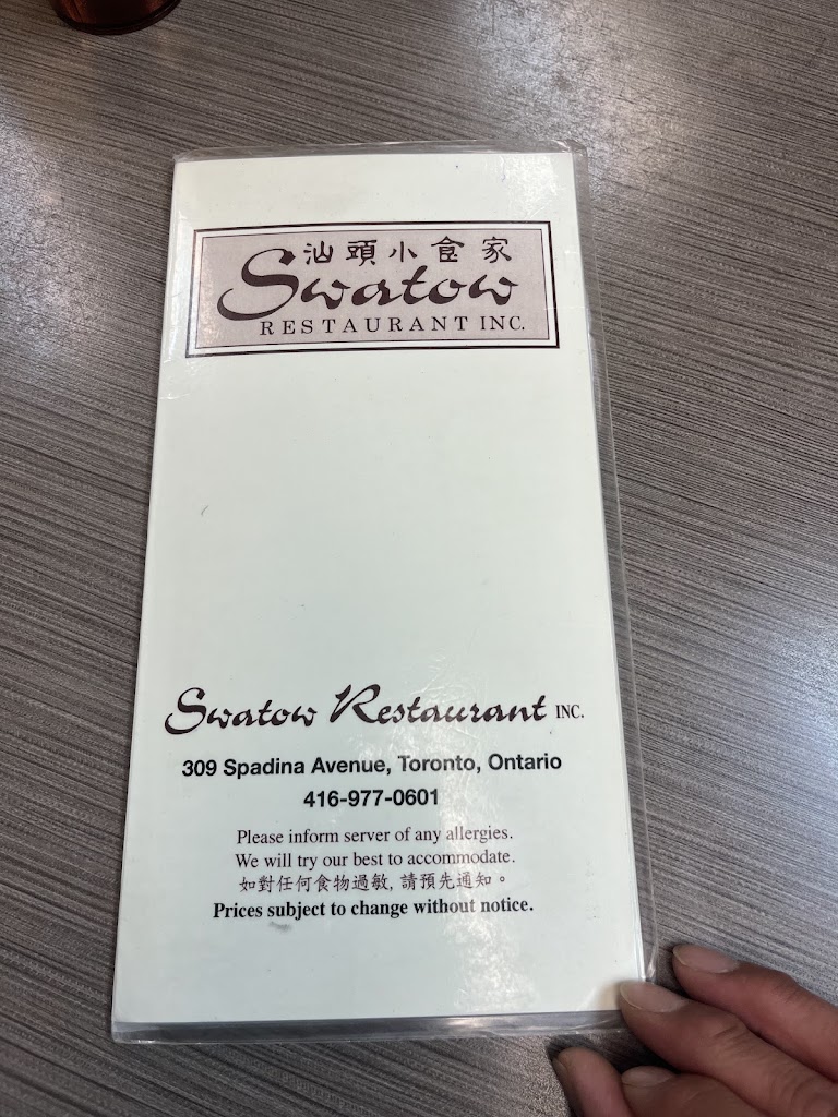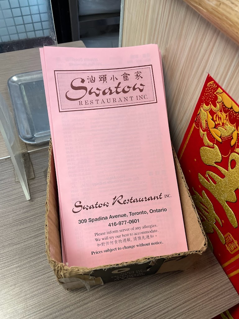 A No-Frills Gem: Swatow Swatow, a timeless, cash-only hole-in-the-wall, is a true hidden gem in Toronto. Despite its unassuming exterior, this place has been drawing crowds for years, and for good reason. The star of the show is still undoubtedly their BBQ pork chicken soup. On a cold day, its the perfect comfort food. We also enjoyed their classic dishes like spring rolls, fried rice, and chow mein, all of which were delicious and reasonably priced. While the service is efficient, dont expect a warm and fuzzy experience. The focus here is on the food, and the staff is more concerned with getting orders out quickly than providing exceptional customer service. If youre looking for a no-frills, authentic Chinese dining experience, Swatow is a must-visit. Just be prepared for a quick and efficient meal. *-*-*-*-*-*-* 2017: Spectacular bbq pork noodle soup for a VERY reasonable price.The broth is next level and perhaps one of the best in chinatown. Service is a bit lackluster but the food is worth while