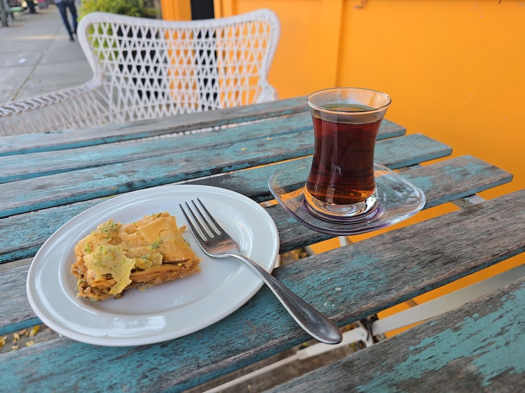 I tried an iced latte for the first time at the café, and the owners were incredibly kind. They offered me baklava, a Turkish dessert, to try. After tasting the baklava, I found my new dessert love and have been regularly visiting the café ever since to enjoy baklava. I ve also tried their flatbread and a type of Turkish rolls in leaves, which are unique to Turkish cuisine and absolutely delicious. I highly recommend everyone to visit and try these offerings.
