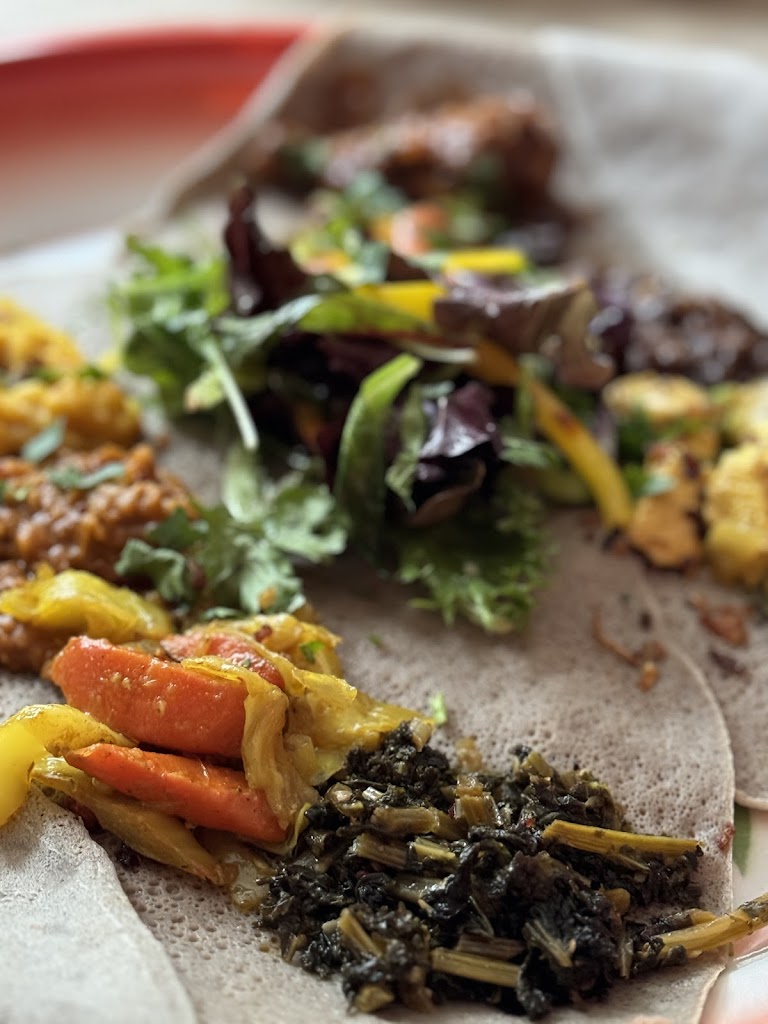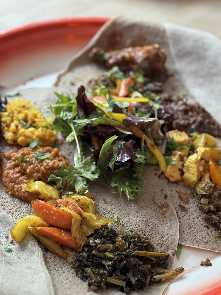 love this ethiopian restaurant! so tasty, priced well, and even has a bar. the atmosphere was rlly nice i love how they dim the lights at night. my sisters and i got so much food and was satisfied at the end. always so pleased with how ethiopian cuisine has such a great vegan/vegetarian food variety which tastes so good btw. would definitely come again