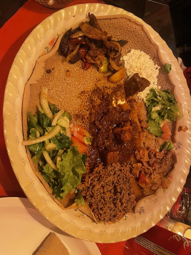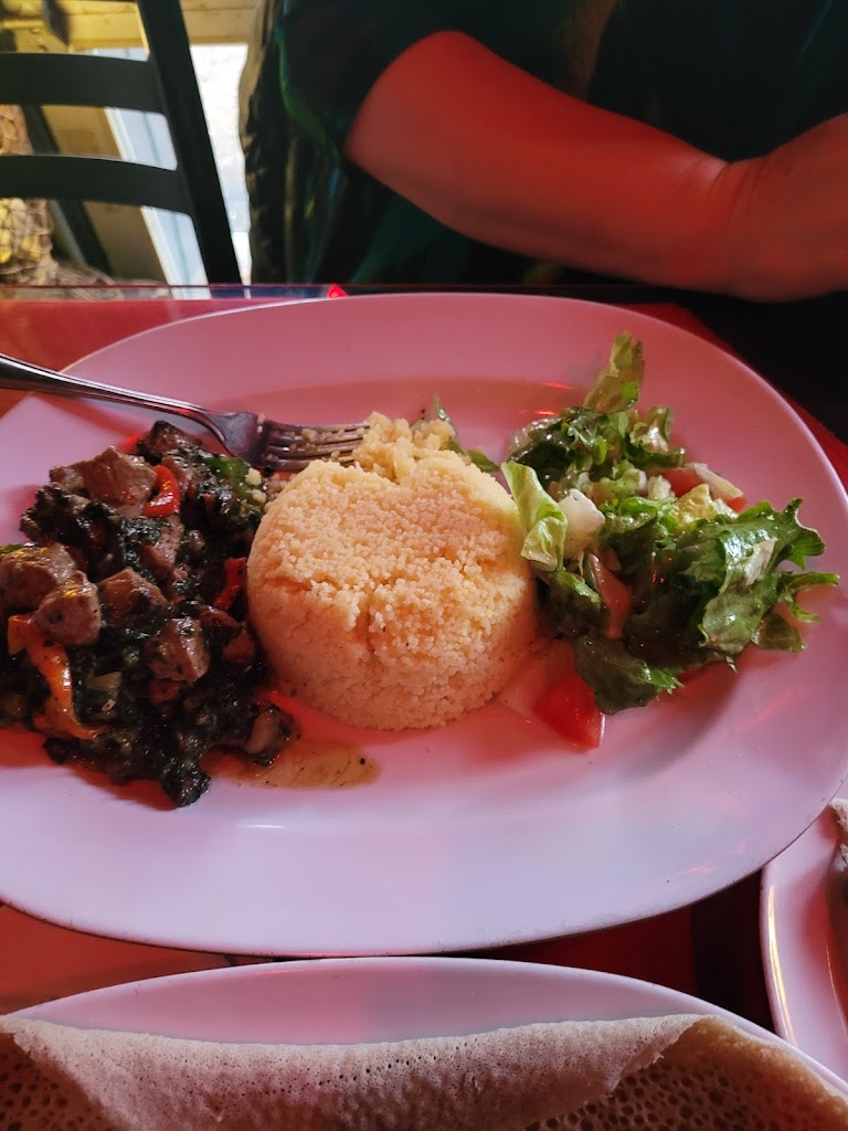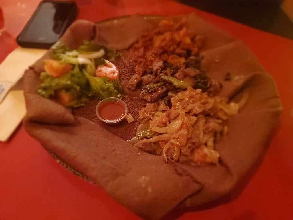 This was my first time trying Ethiopian food and it was quite good. I ordered the meat platter which offered 3 different styles of cooked beef with vegetables & salad . The platter was well prepared and what impressed me the most was the injera which was really good and complemented the beef stew. The only downside would be as someone who enjoys spice i would have liked if the beef stew was a bit more spicy . Overall rating would be 7.2/10
