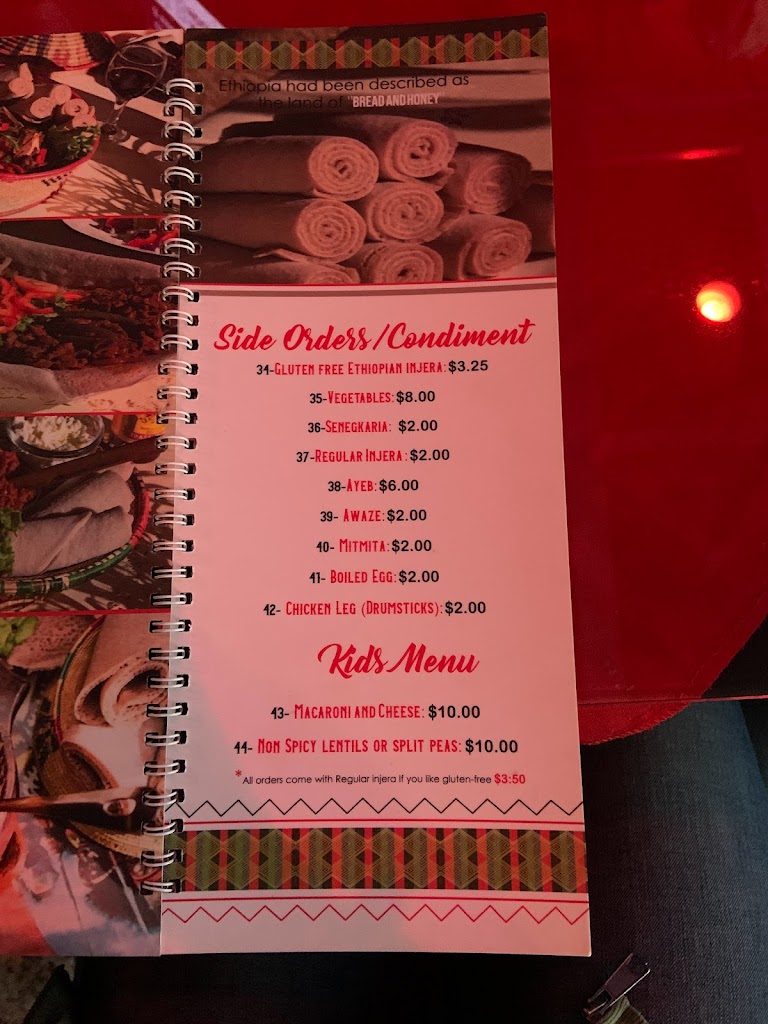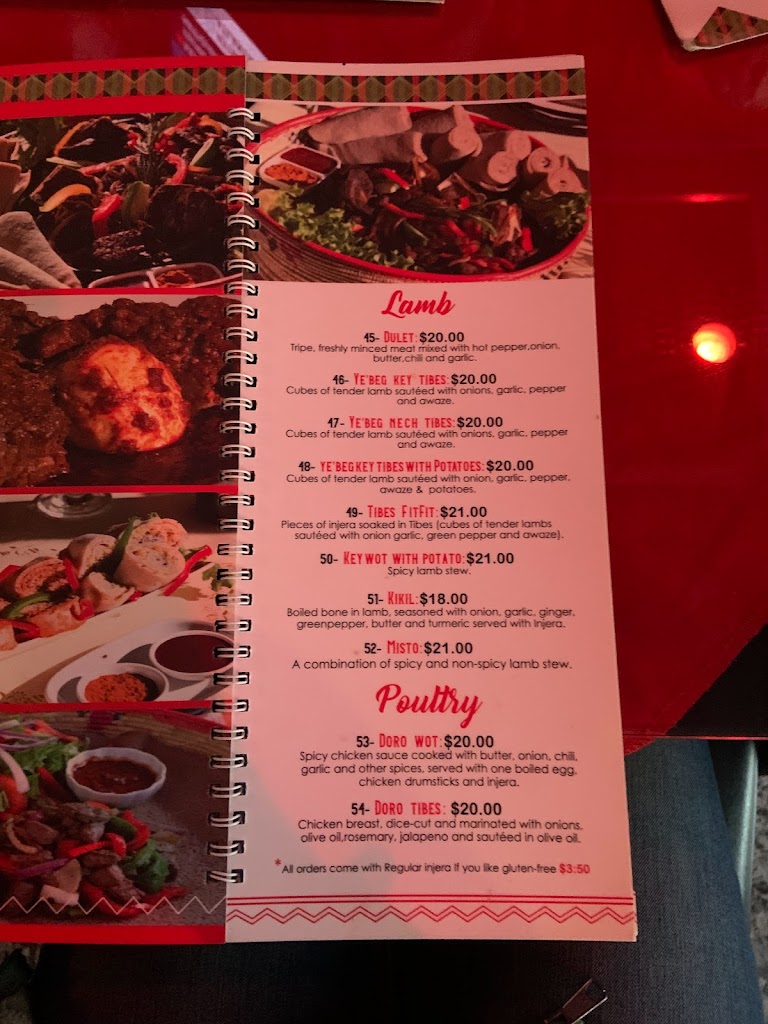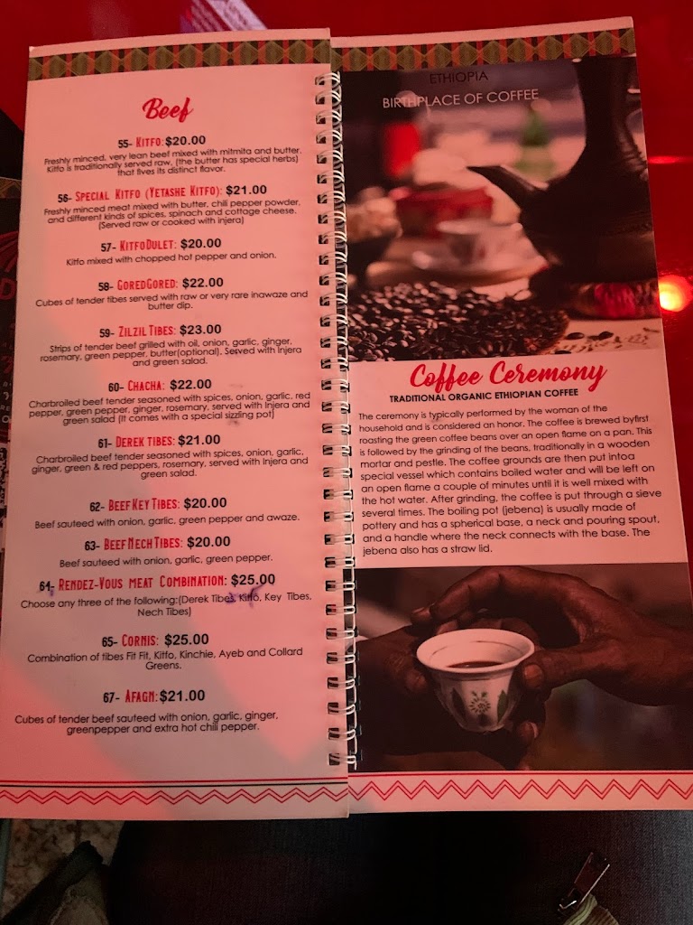 It’s been a while I had Ethiopean food and I took my friend from out of town to impress her with their amazing platter. Ordered veg +meat combo platter. My friend was impressed. It was around $62 including 1 soft drink and there was leftover., However My knowlege of Ethiopean food is very shallow, I only know some names such as “Tibs”( meat fried with butter, garlic , onion & pepper), “Injera”(fermented flat bread) “Doro Wat” “Awaze”(sauce), etc. Their menu description in English was very confusing. Almost all the meat dishes had different names but they were mostly sauteed with butter, garlic, onion & pepper. Wait staff was trying to explain that there are various options of meat such as spicy, non spicy, ground meat version, etc. but I was not even sure, I was served with what I actually chose. For example, if you look at #60 =, only difference I see is one is served on sizzling plate. However their names are completely different. 60. ChachA Charbroiled beef tender seasoned with spices, onion, garlic, red pepper, green pepper, ginger, rosemary, served with Injera and green salad (It comes with a special sizzling pot). 61. DereK Tibes Charbroiled beef tender seasoned with spices, onion, garlic, ginger, green & red peppers, rosemary, served with Injera and green salad. Experience was overall great but I with they had better menu description.