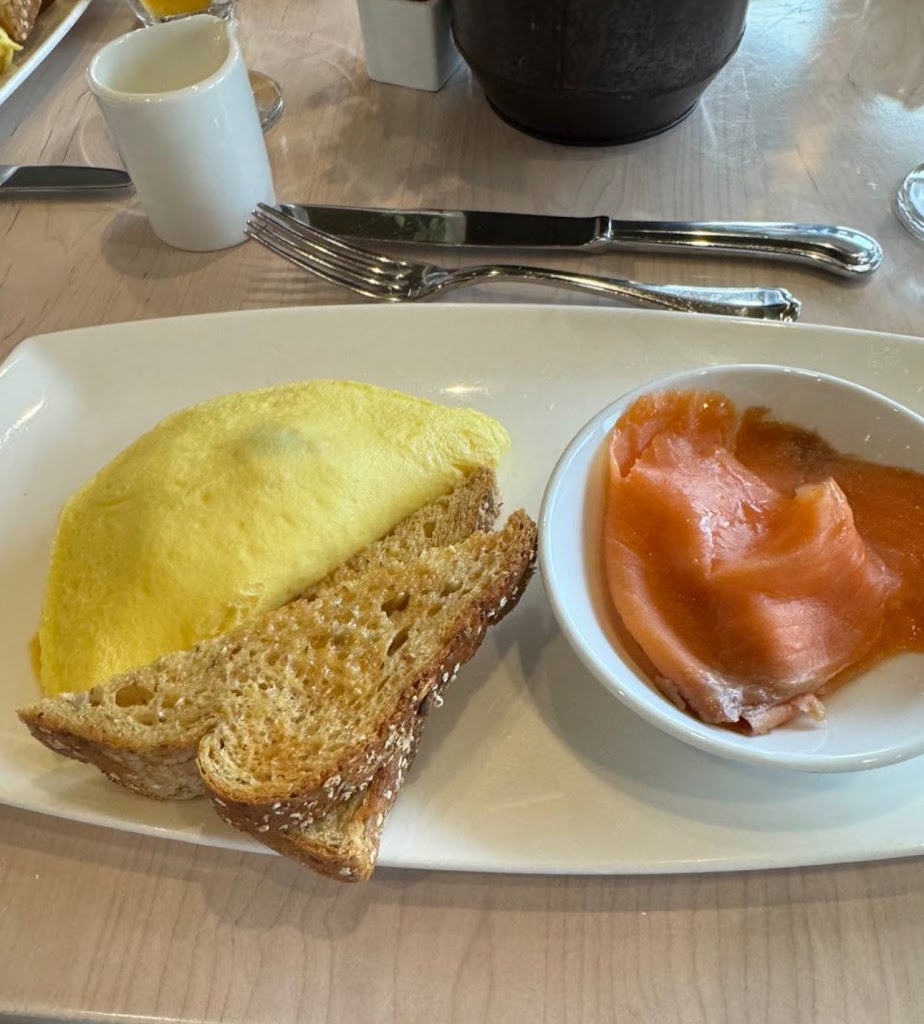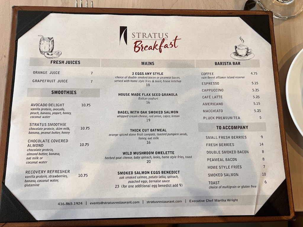 We read about Stratus on TripAdvisor and decided to try it for breakfast the other day. We were seated at a table looking out at Lake Ontario and the Union Station area of downtown Toronto. Our server was excellent and made us beautiful cappuccini with designs. Made me think of Firenze! We had the Salmon Eggs Benedict and the poached eggs combo. Both were excellent!