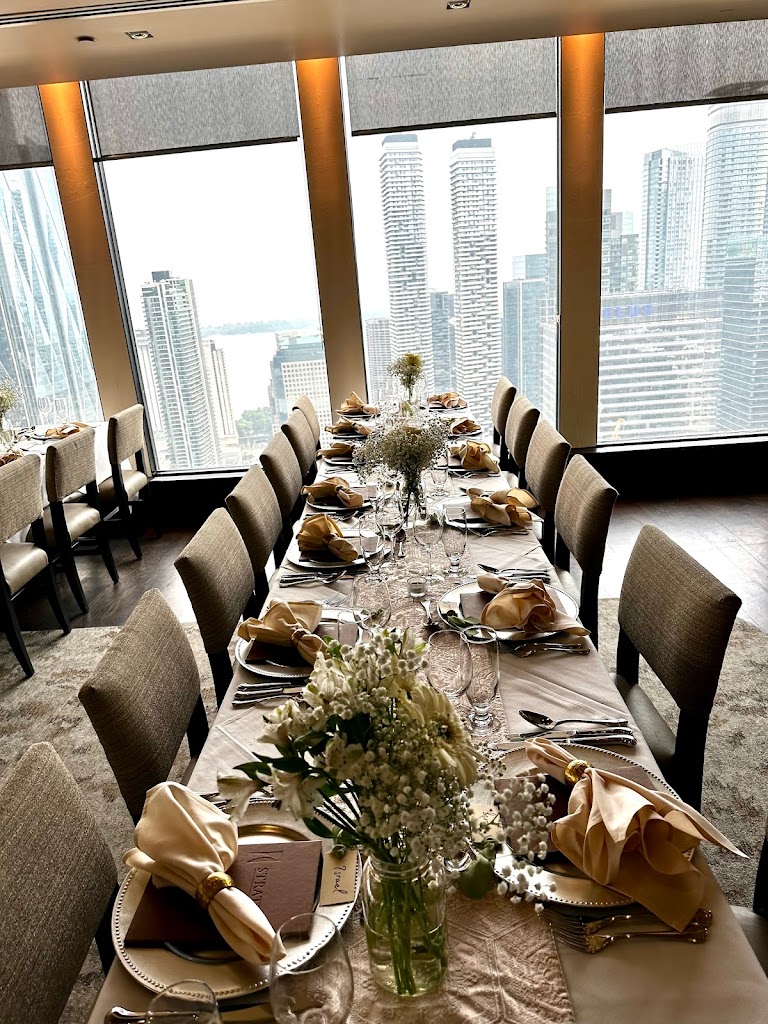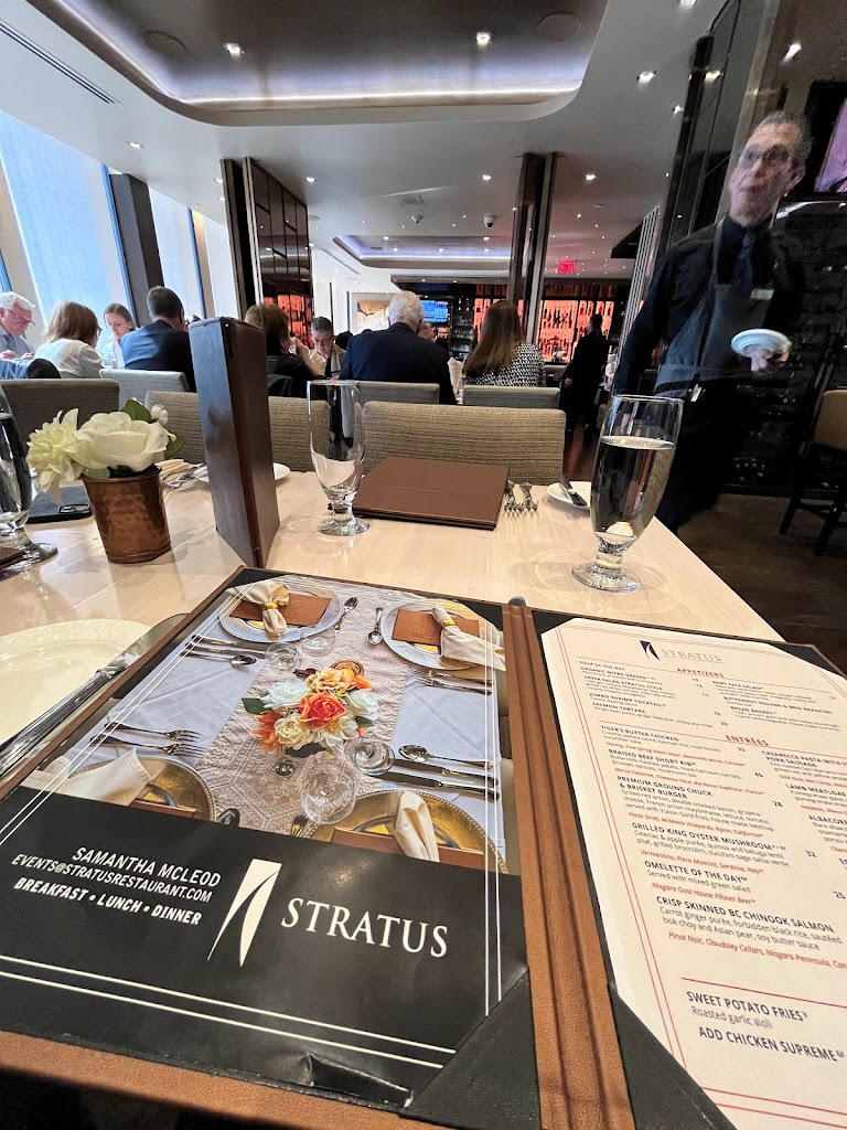 Recently hosted a business lunch at Stratus’ private room. Stunning view of DT Toronto along with professional set up of the room. Event coordinator and serving staff were friendly, knowledgeable and made sure we were well taken of. I would recommend the executive lunch option for larger parties. Menu can also be very accommodating for various dietary needs.