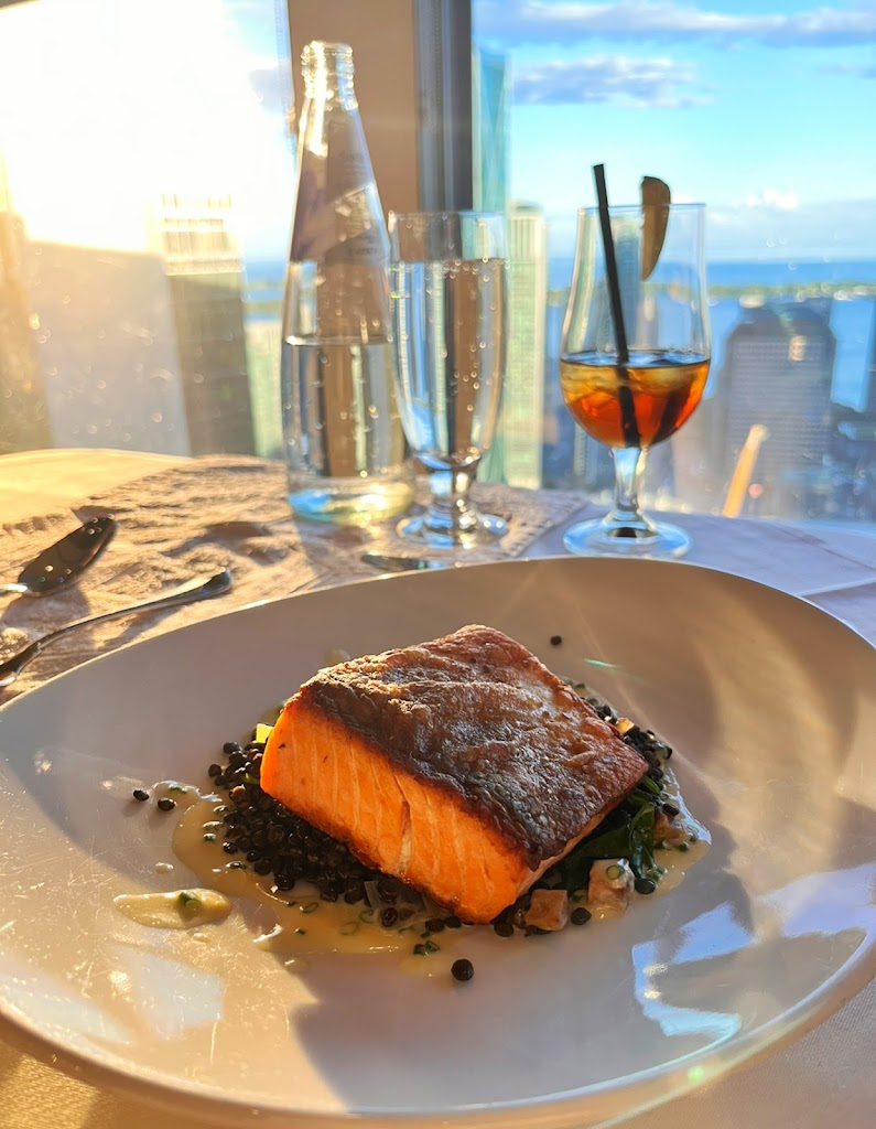 Came here for a group event and want to first point out the atmosphere, view, and services were exceptional. Beautiful city view especially during the sunset and evening. The food, however, was a bit more on the mediocre side. The salad and salmon lacked the flavors I was expecting. The braised short rib, though, was really good. At the start, it was a bit on the bland side, but with a little bit of salt the flavor were significantly elevated. The texture was amazing that it simply melts in your mouth. It was definitely the highlight dish of the evening. The crème brûlée was rather sour, but quickly acquired to be rather tasty. We had an open bar which was great, but the alcohol felt diluted. Overall, great experience and still a wonderful restaurant.